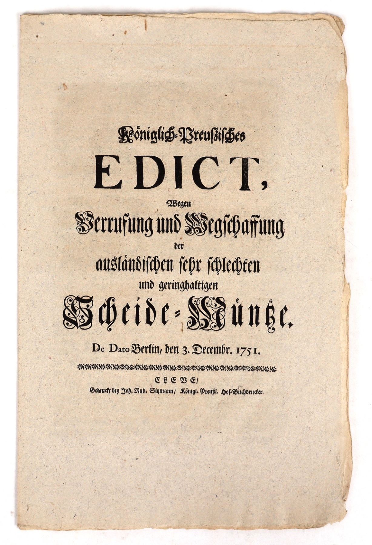 Royal Prussian Edict of 3 December 1751 (Berlin). Despite the fact that we ordered new gold and silver coins to be minted, so that our loyal subjects could be supplied with a good and reliable currency and our land rid of worthless foreign coins, we are to our displeasure forced to remark that our new gold and silver coins are hardly - or not at all - in circulation and that our country is flooded with bad and useless coins... 8 x 13 inches; ink on fabric.