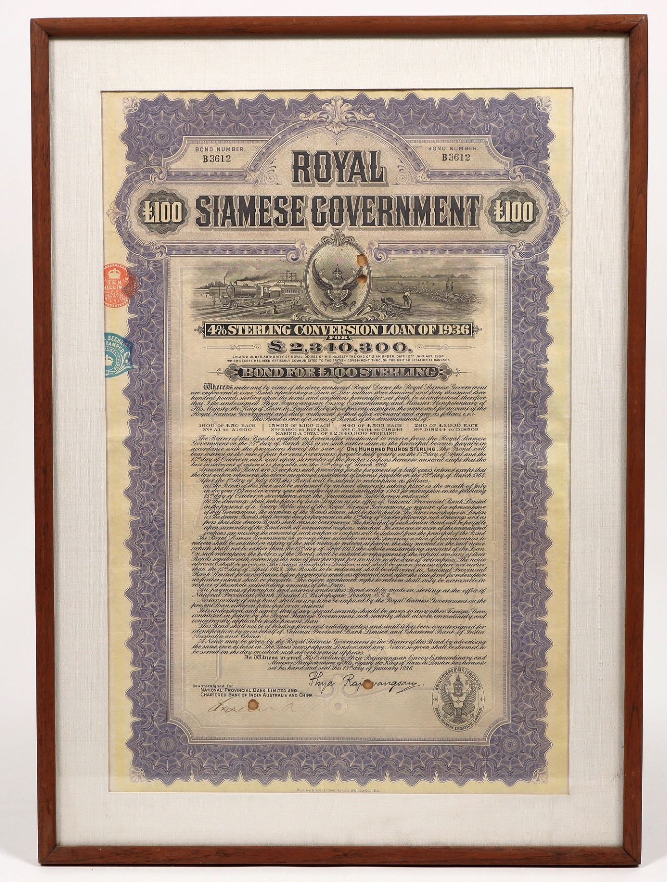 Framed Royal Siamese Government L100 bond. One of the most attractive bonds to come across my describing desk, with pretty violet print and train and boat vignettes. Brown wood frame 22.5x16.25".