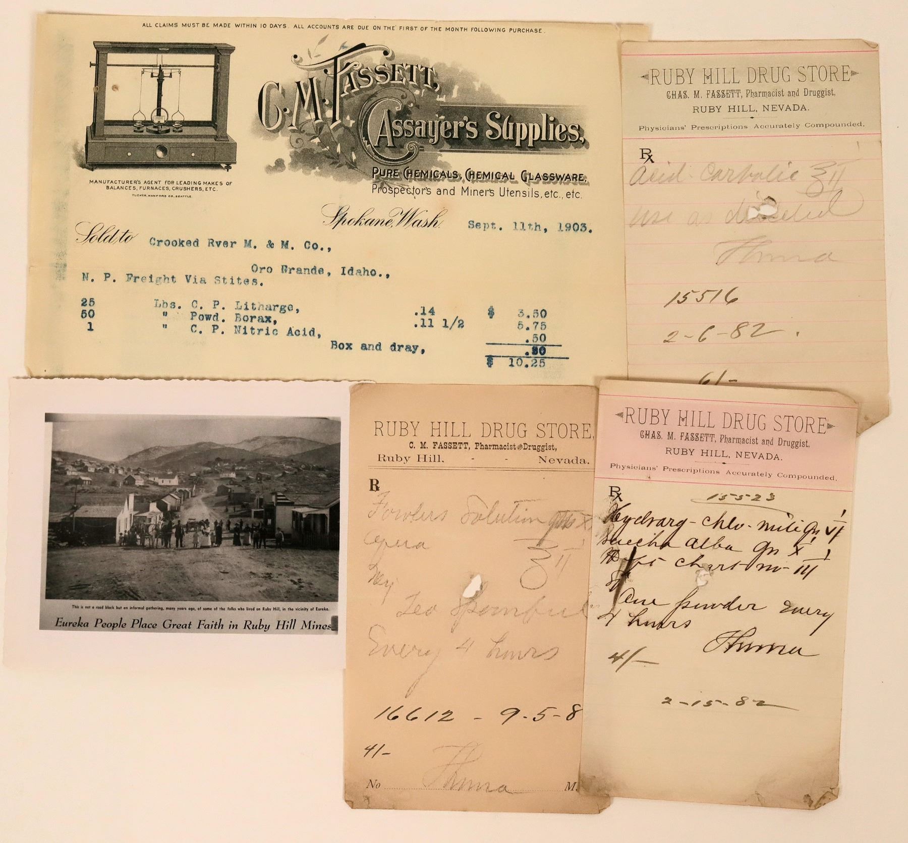 Lot of 5. Ruby Hill Drug Store, Chas. M. Fassett, Pharmacist and Druggist. 1) Three different prescription slips, all issued in 1882, two in color. 5.5 x 3.25" Soiling, toning. 2) Pictorial billhead for C.M. Fassett Assayer's Supplies, Spokane, Washington, 1903. Vignette of gold balance! Billed to the Crooked River M& MC of Oro Grande, Idaho. 3) 4 x 5" repro. print of people standing in street at Ruby Hill. Charles Fassett came to Reno in 1878 and worked as a pharmacist. He moved to Eureka in 1880 and bought Wlch's Ruby Hill Drug Store within a year. He operated this drug store until 1887. In 1886, he opened a store in Palisade. He moved to Reno in 1887 and opened the Fassett Drug Store. In 1889, he sold to William Pinniger and moved to Spokane to join friend (and fellow Nevada druggist) Stowell. For more background on Fassett, please see Volume Two of the Nevada Bottle Book.