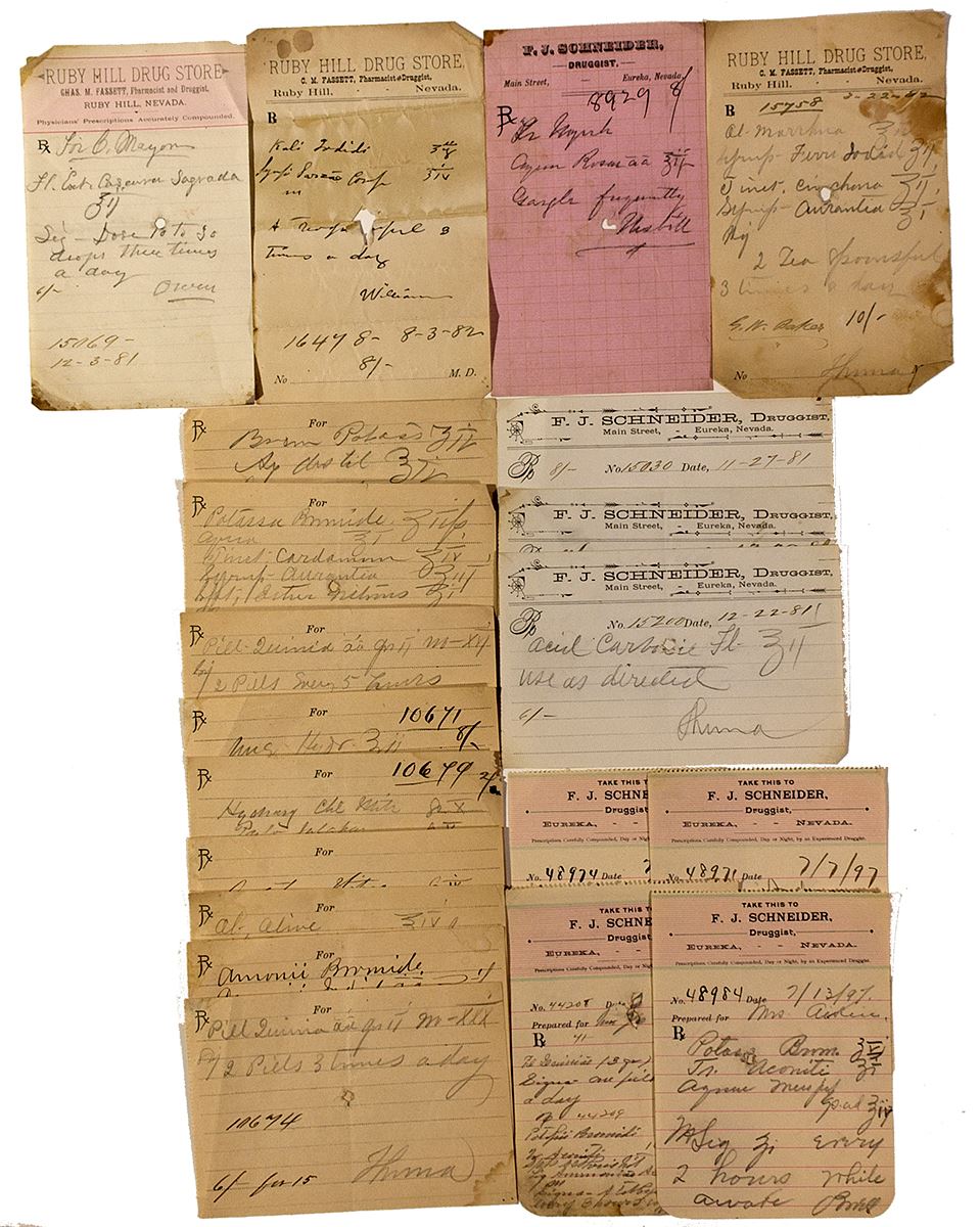 Lot of 20 handwritten medicinal notes from The Ruby Hill Drug Store (3) and druggist F.J. Schneider of Eureka.
