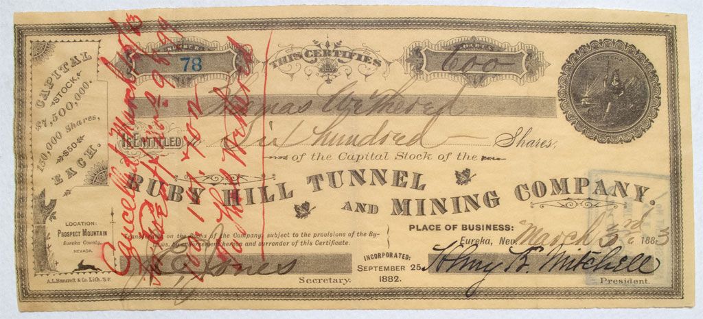 Ruby Hill Tunnel & Mining Company stock signed by future Governor Jones