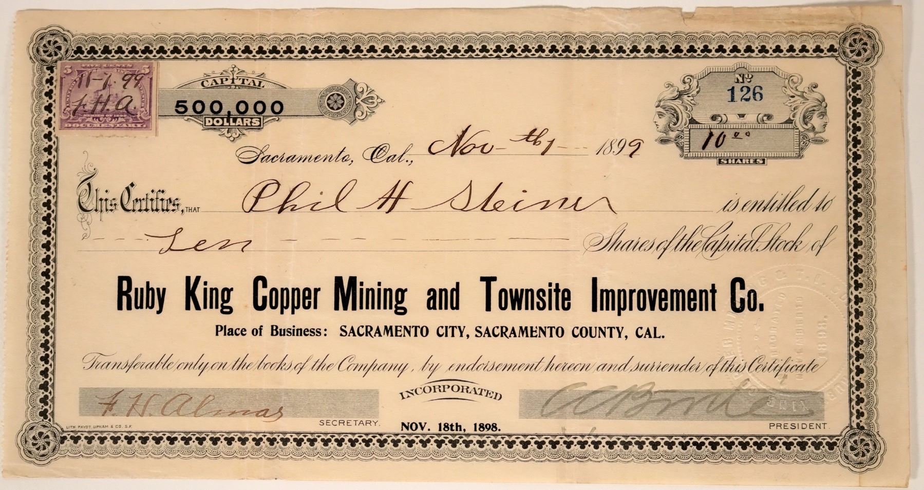 Place of Business: Sacramento City, Sacramento County, Cal. No. 126, issued for 10 shares to Philip Steiner in 1899. Signed by the president and secretary. Not cancelled. Black border and print. 5 cent stamp. Heavy folds, toning. Tear upper right edge. 5.25 x 10" Became the Ruby Mineral Paint Company. Their "paint rock" mine was located near Lodoga, Colusa County, California. 40 acres, 6 unpatented claims. Also some copper claims to the south. [Mines and mineral resources of the counties of Colusa, Glenn, Lake, Marin, Napa, Solano, Sonoma, Yolo, 1915, pg.8-9]