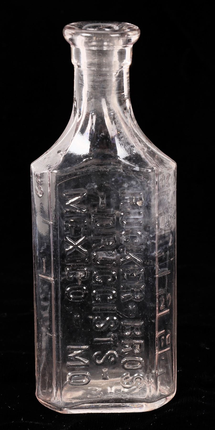 Clear embossed Rucker-Bros./-Druggists-/Mexico, - Mo. 4.75". No apparent chips or cracks.