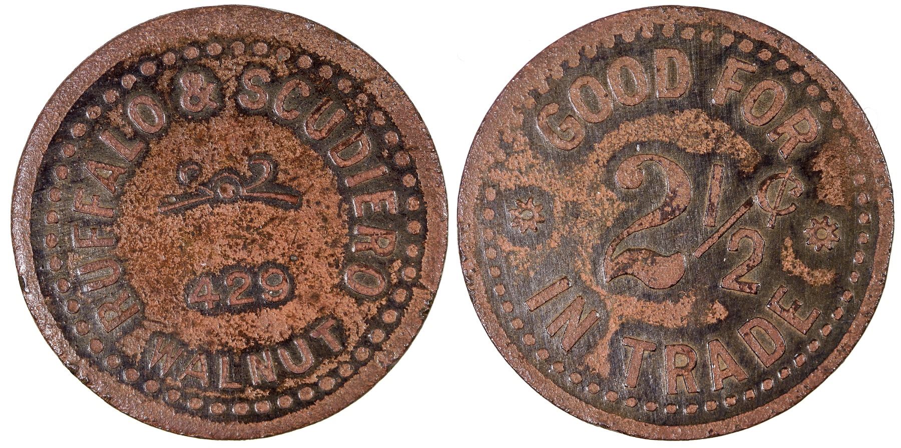 Rare unlisted Kansas City token, but found on tokencatalog.com. RUFFALO & SCUDIERO / 429 / WALNUT // GOOD FOR / 2Ω¢ / IN TRADE; Br., rd., 24 mm.