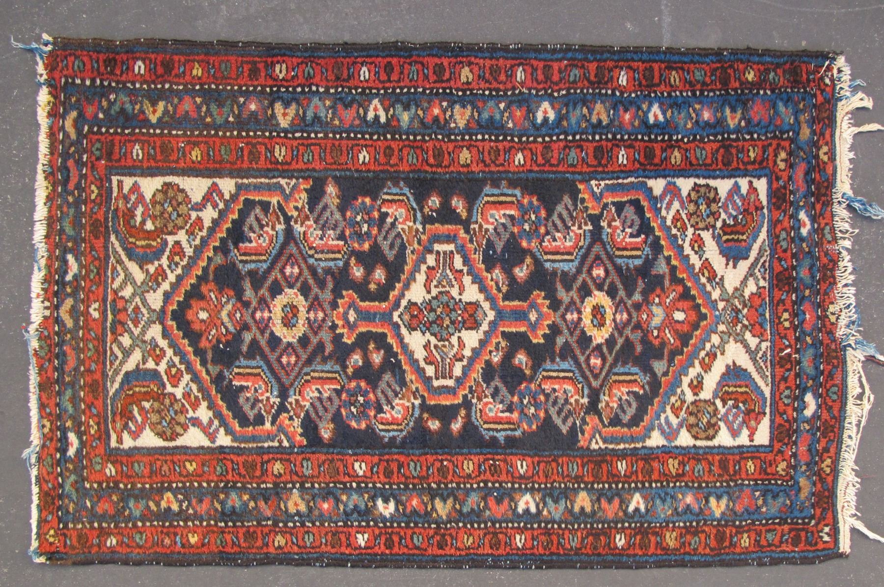 Rug, only slight damage at edge & fridge from age. Please inspect. 31" x 46" blue with cream, burnt orange. Pile .25".