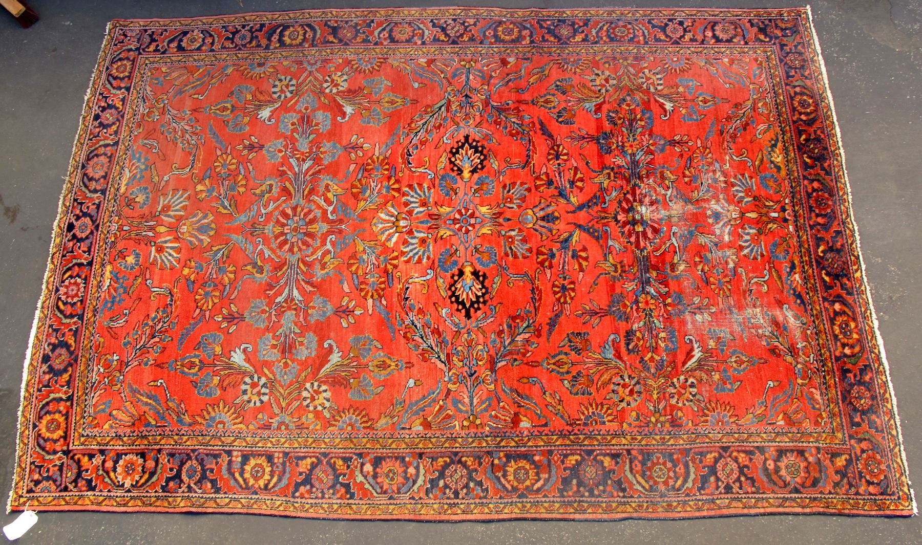 Beautiful large Serougen Rug. 7'8" x 11'. Terracotta, navy blue, powder blue & gold. With border. In good condition. The art of manufacturing carpets was introduced in India, probably by the great mogul Akbar (1556-1605) which brought in Persian weavers together with skilled pattern artists mainly for producing carpets for his palace. During the 16th, 17th and 18th century many fine carpets were woven here made of the finest sheep wool and silk, with Persian patterns. The quality sank during the 19th century and right up to the middle of the 20th century, except some smaller productions in the cities of Srinagar, Amritsar and Agra. After India's independence in 1947 the commercial manufacturing had a reawakening. Even if most of the weavers moved to Pakistan, they were up and running again thanks to the concentration on education of youths, men and women. Ben-Tcahvtchavadze Collection of Ontario, Canada