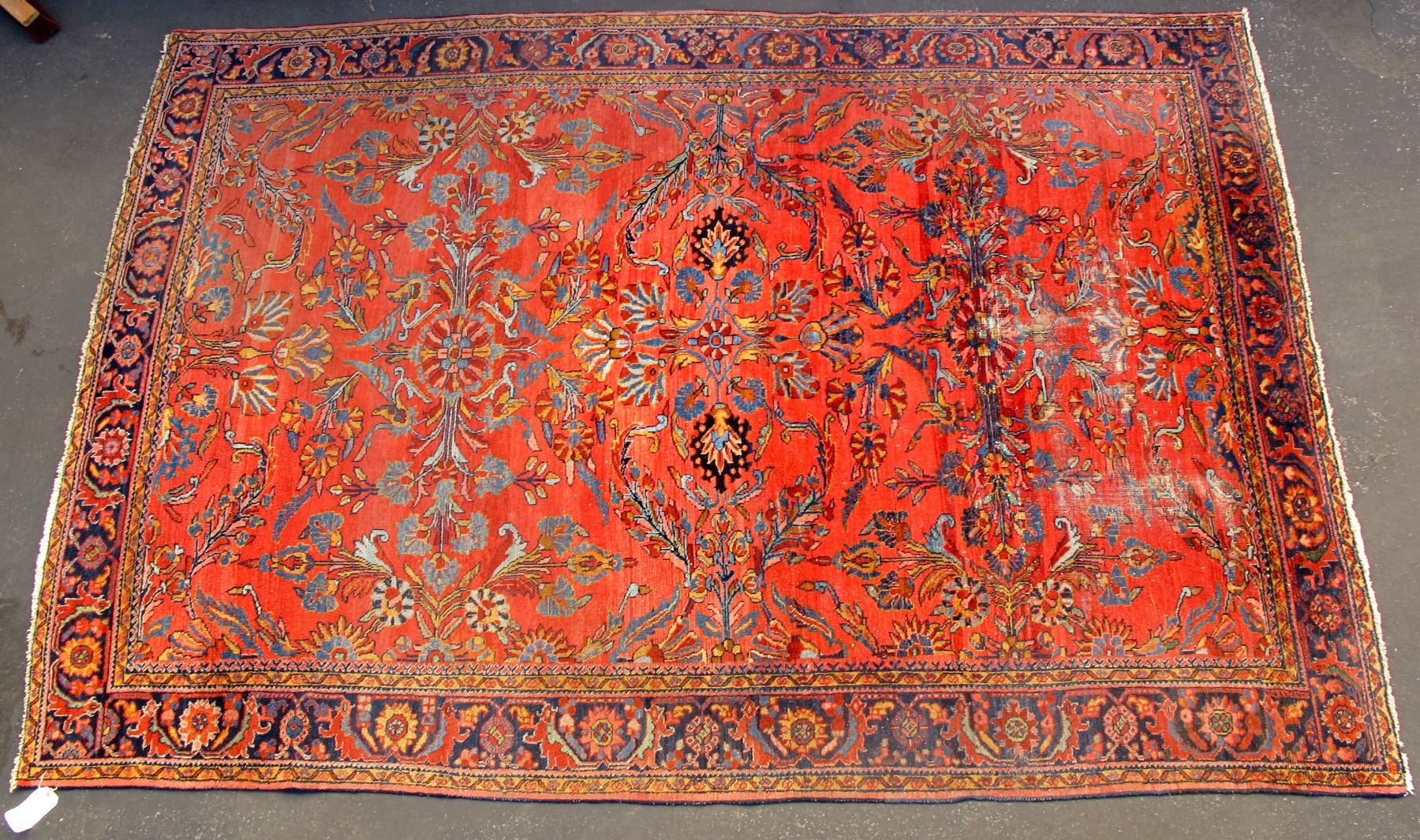 Beautiful large Serougen Rug. 7'8" x 11'. Terracotta, navy blue, powder blue & gold. With border. In good condition. The art of manufacturing carpets was introduced in India, probably by the great mogul Akbar (1556-1605) which brought in Persian weavers together with skilled pattern artists mainly for producing carpets for his palace. During the 16th, 17th and 18th century many fine carpets were woven here made of the finest sheep wool and silk, with Persian patterns. The quality sank during the 19th century and right up to the middle of the 20th century, except some smaller productions in the cities of Srinagar, Amritsar and Agra. After India's independence in 1947 the commercial manufacturing had a reawakening. Even if most of the weavers moved to Pakistan, they were up and running again thanks to the concentration on education of youths, men and women.
