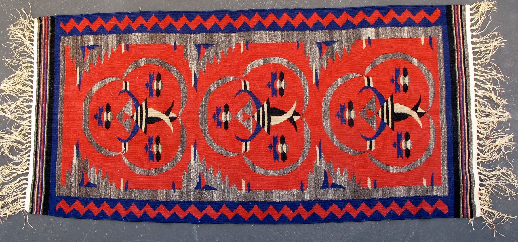 Hand made wool rug. 65" x 31", beautiful colors. Has been hung on wall. Good condition. State: City: Date: Post WWII HWAC# 83532
