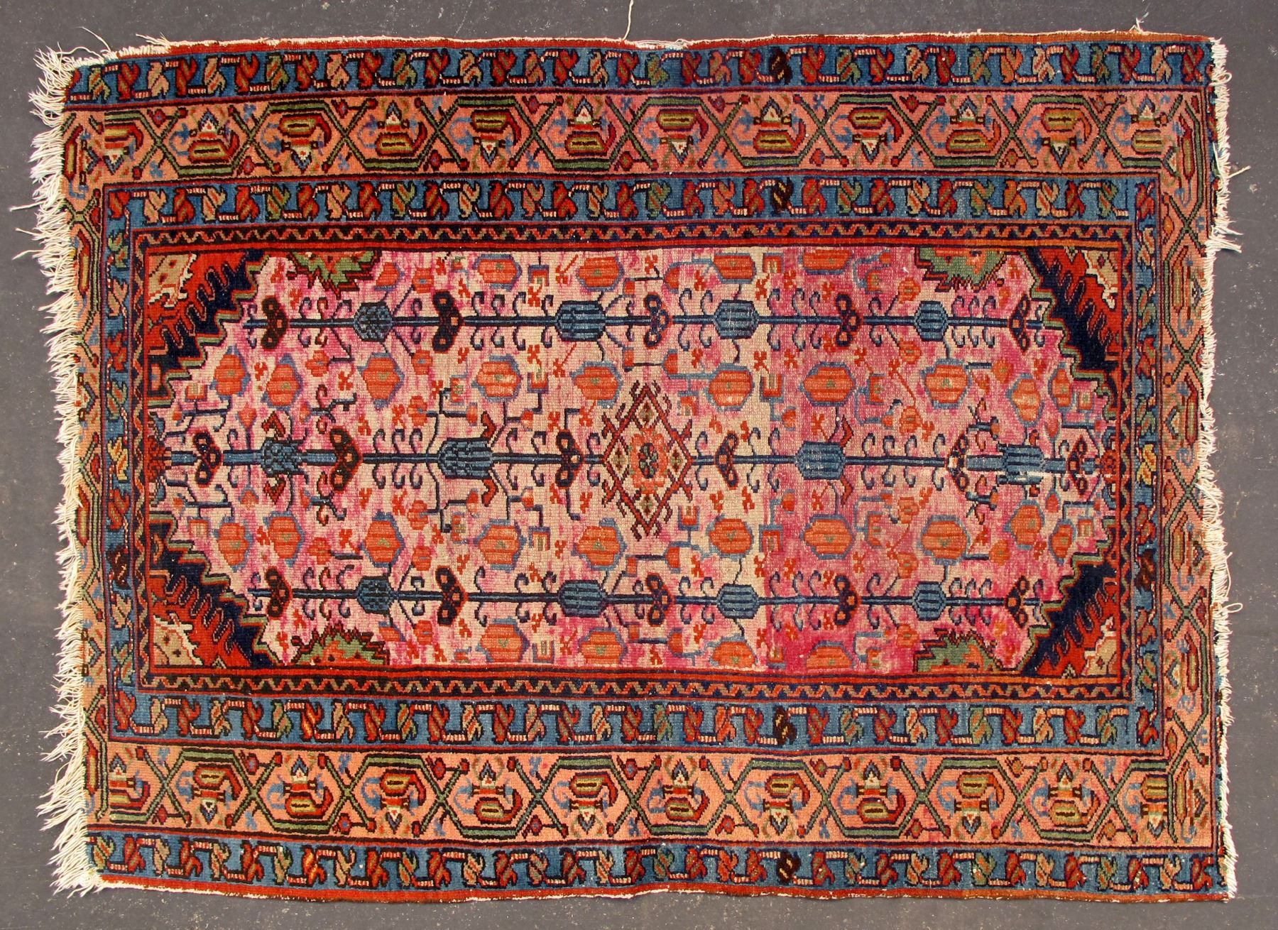 38" x 50", nice wool rug with blues, oranges, reds & more. Has slight wear in left edge. Please inspect. State: City: Date: c1900's HWAC# 84477