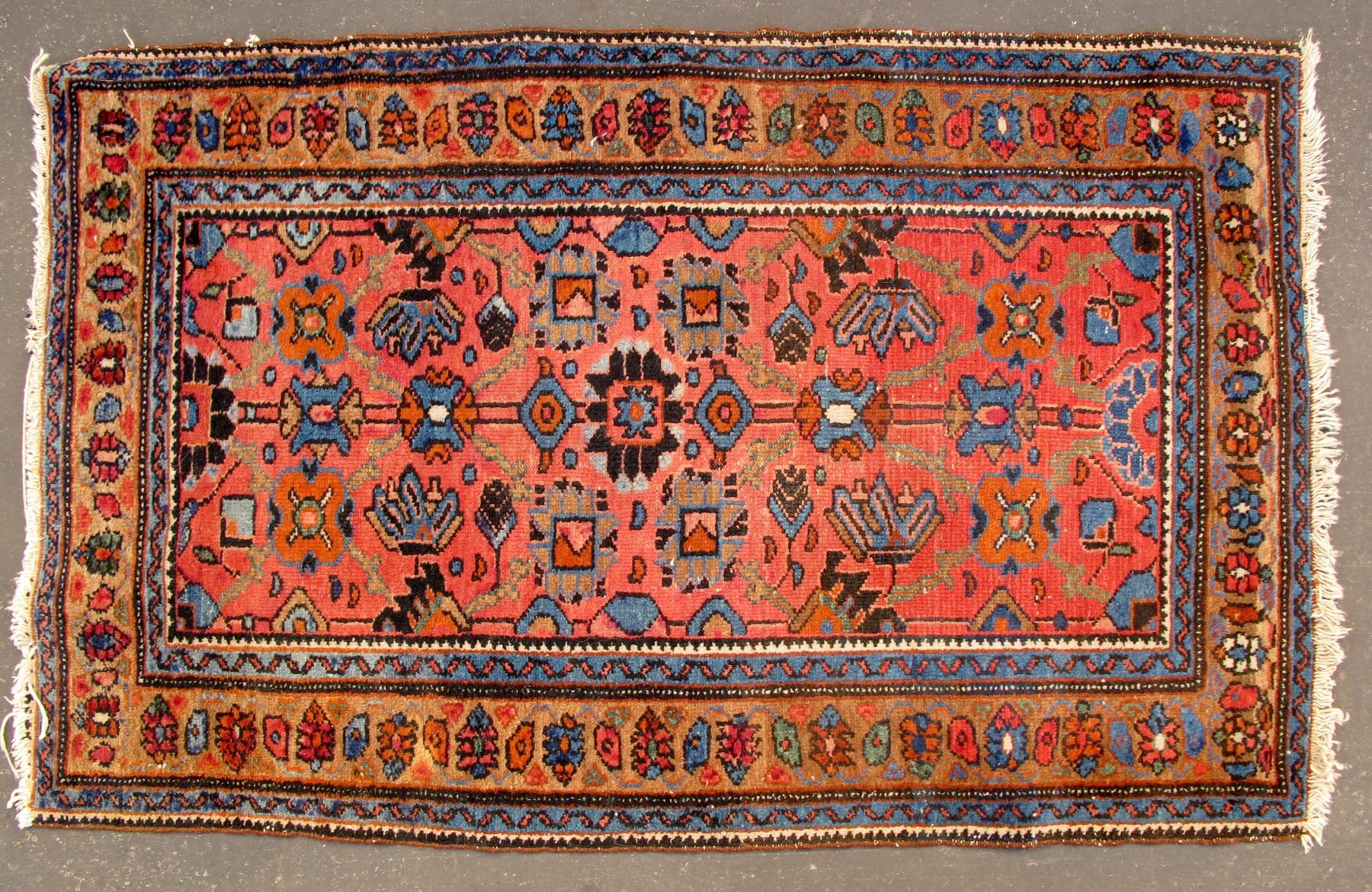 29" x 46". Rug in good condition, primarily rust color with blues & taupe. Slight fraying at fringe area, please inspect. State: City: Date: c1900's HWAC# 84478