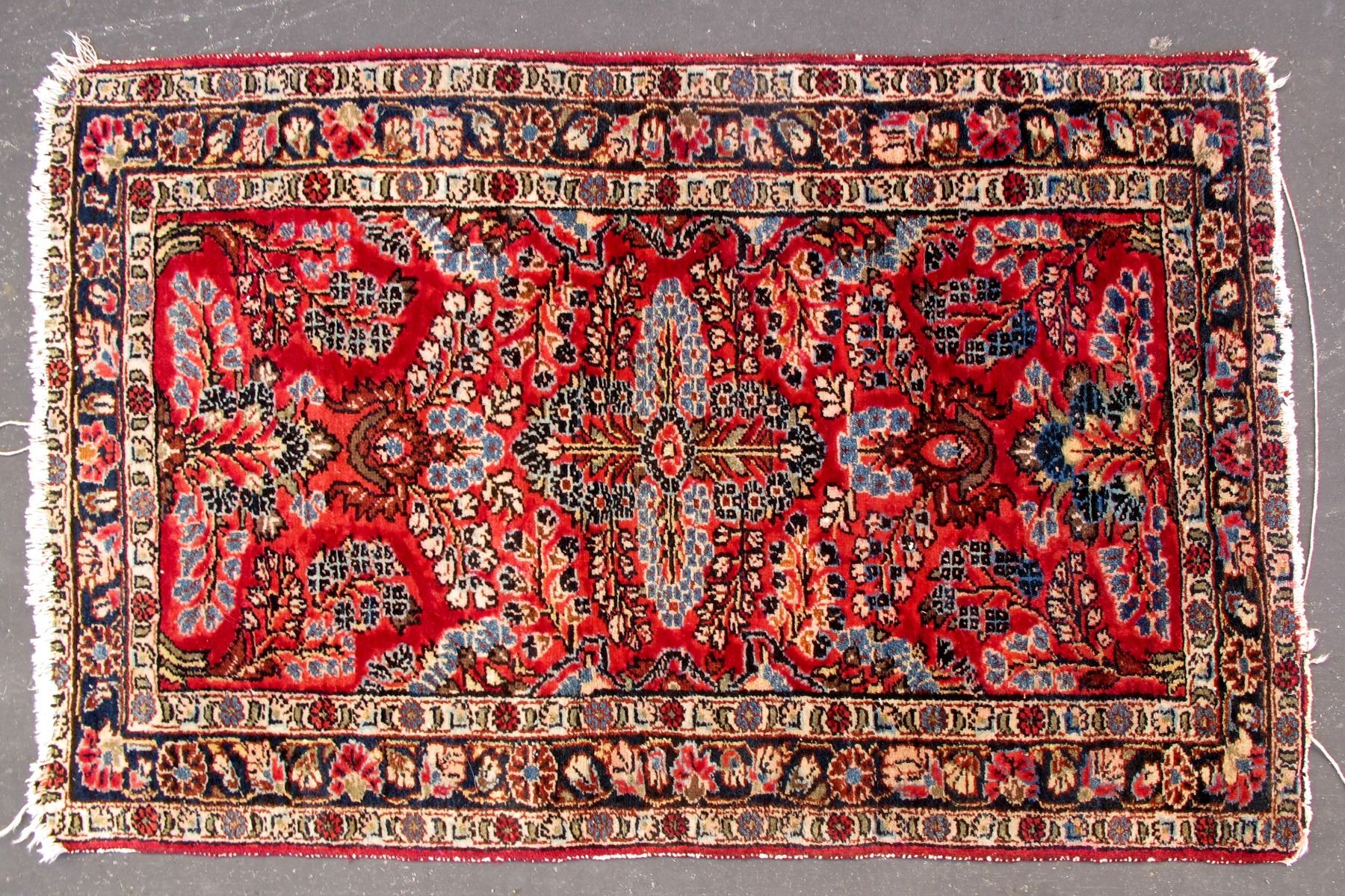 29" x 46", Ruby red color with blues & cream on border. Slight wear on fringe, please inspect. State: City: Date: c1900's HWAC# 84479