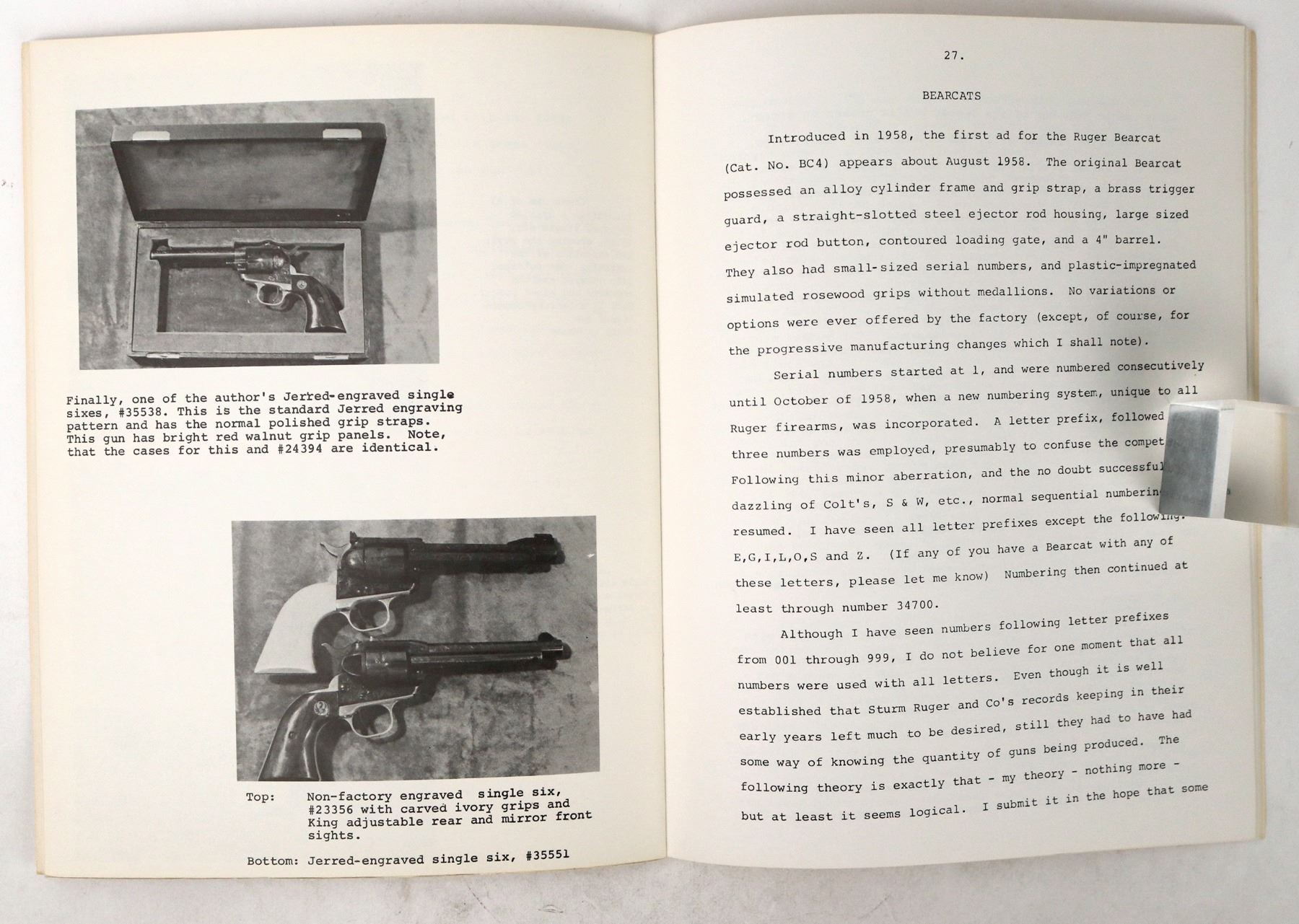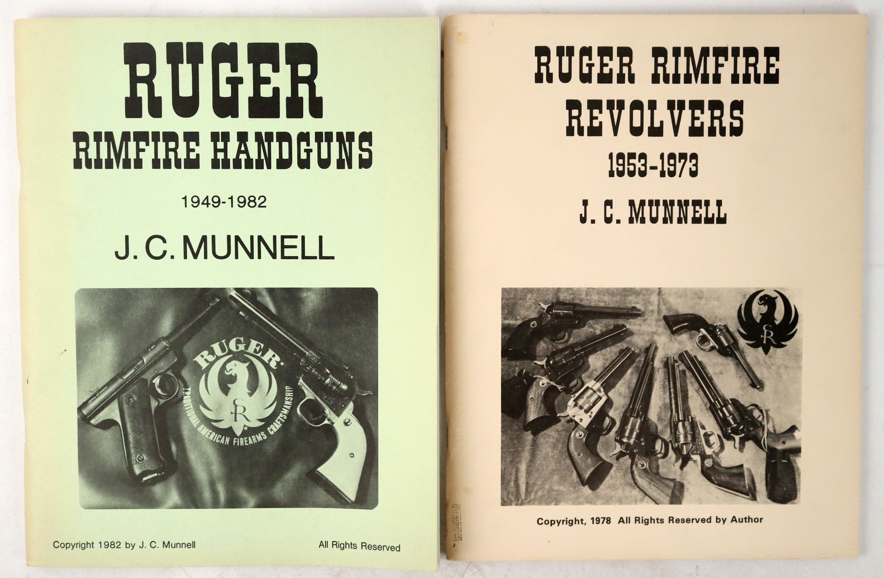 These are two paperback books written by J.C. Munnell. Ruger Rimfire Revolvers (1978) pp.40, and Ruger Rimfire Handguns ( 1982) pp. 182, for the serious Ruger collector that includes a number of variations. The author was challenged to make corrections to his production numbers that warranted the second book. Both books in very good condition. Please see photos for details.
