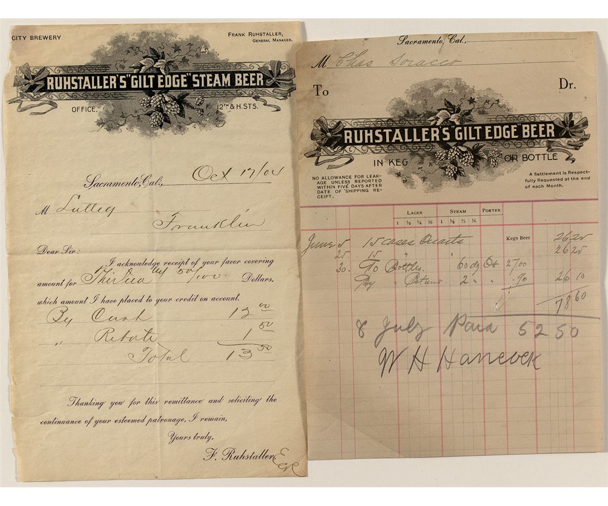 This is a lot of 2. Sacramento was for many the place to be for brewing lager at the turn of the 20th Century. The city was in the middle of a golden age of brewing, and businesses within the city supplied the west coast with brew. 1) Statement for balance due, no date. 2) Receipt of payment, dated October 17, 1904.City: SacramentoCounty: Sacramento CountyState: CADate: c1904