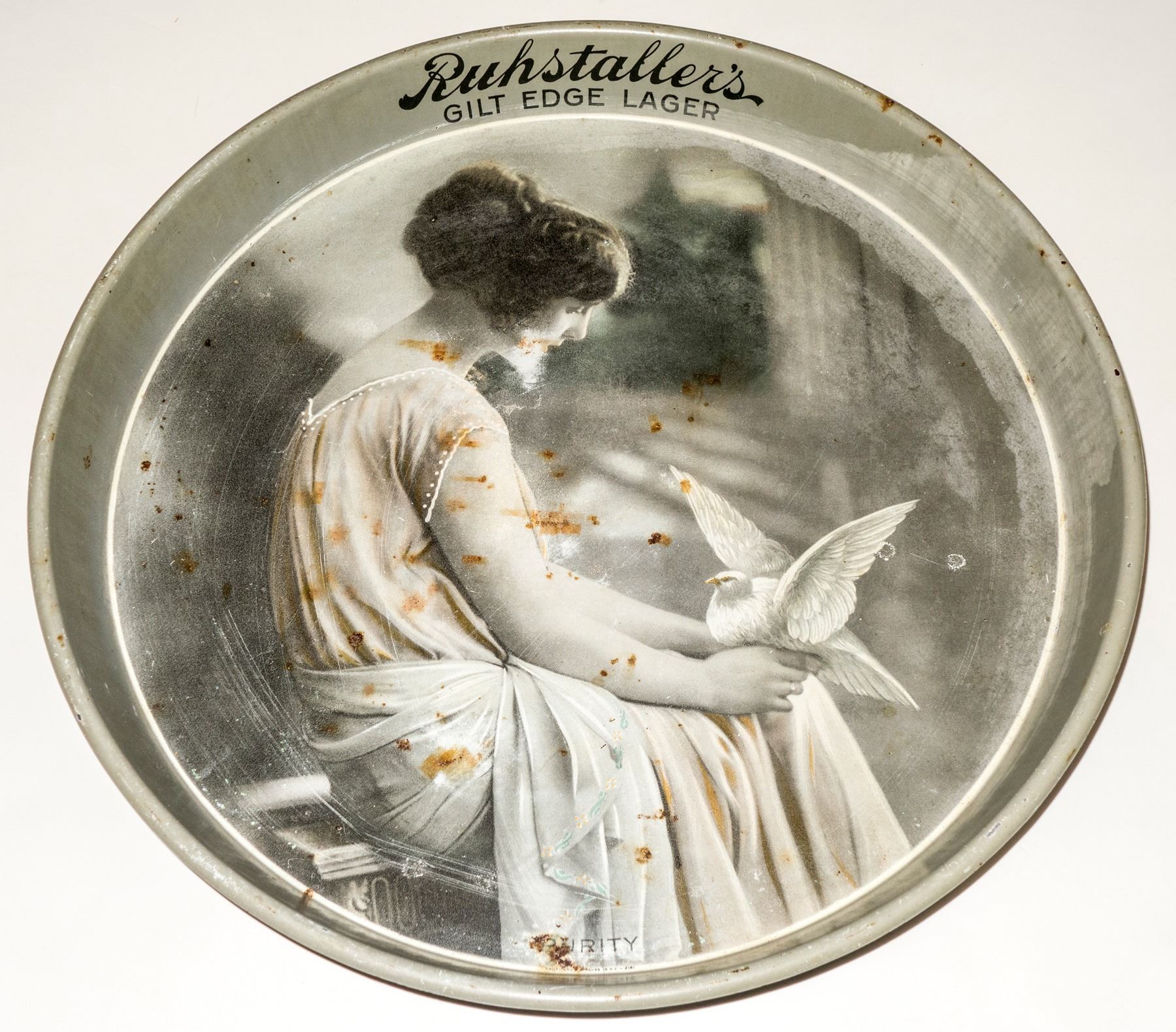 12" diameter. Titled "Purity." Photograph of elegant woman sitting with bird in her lap. Black text along top of rim: "Ruhstaller's Gilt Edge Lager." Black text along bottom of rim: "Sacramento, California." Grey/metallic tones. Areas of soiling/rust. Kaufmann & Strauss Co., N.Y.