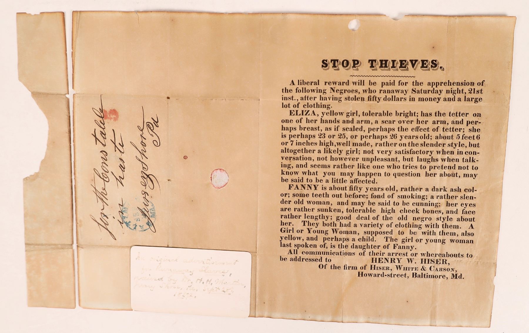 Folded broadside for 2 runaway slaves and thieves who stole $50 and a large lot of money, dated September 28, 1852. Interesting description of the 2 runaways noting tetter, cunning, smoking etc. 9.75x13.5", top hole and chip. From the Hyatt Estate.