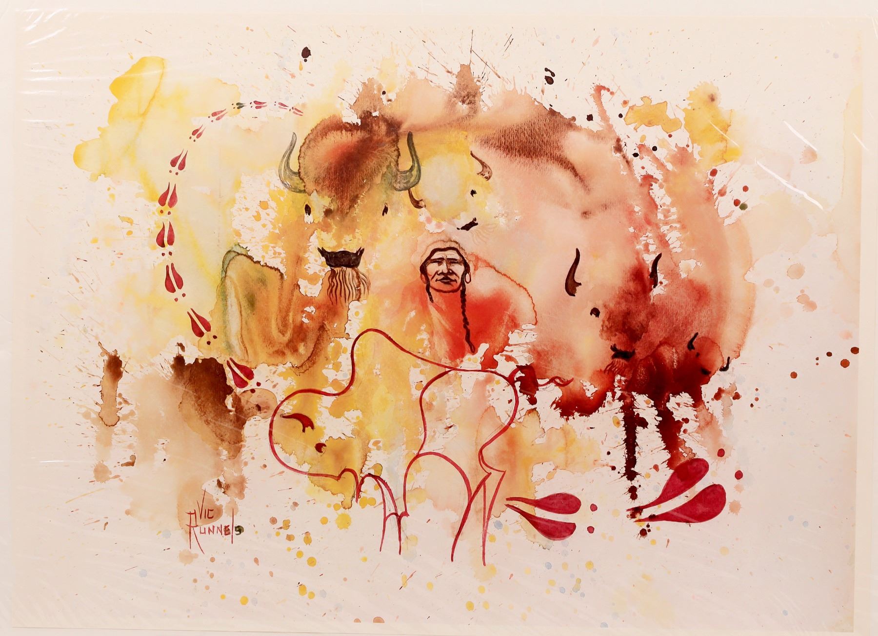 Water color prints (3) that measure 25"x 18" and feature the art of Vic Runnels, Lakota artist who passed in 2017 at the age of 81. He was born and raised on the Pine Ridge Reservation and became famous for his vivid colors and themes, depicting the culture of the Lakota Sioux. These are in very nice condition, waiting to be matted and framed. Please see photos for more details. Pine Ridge South Dakota
