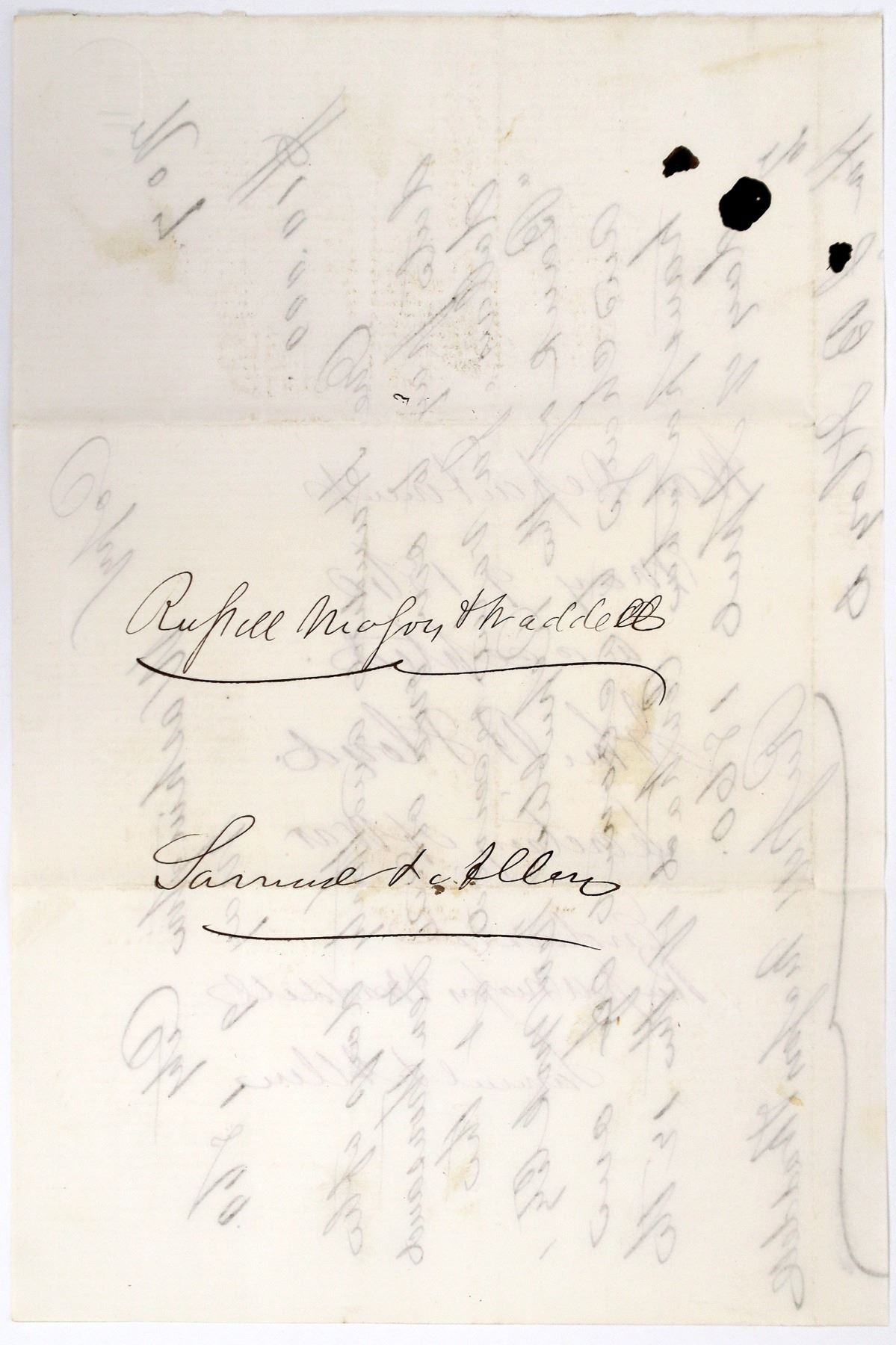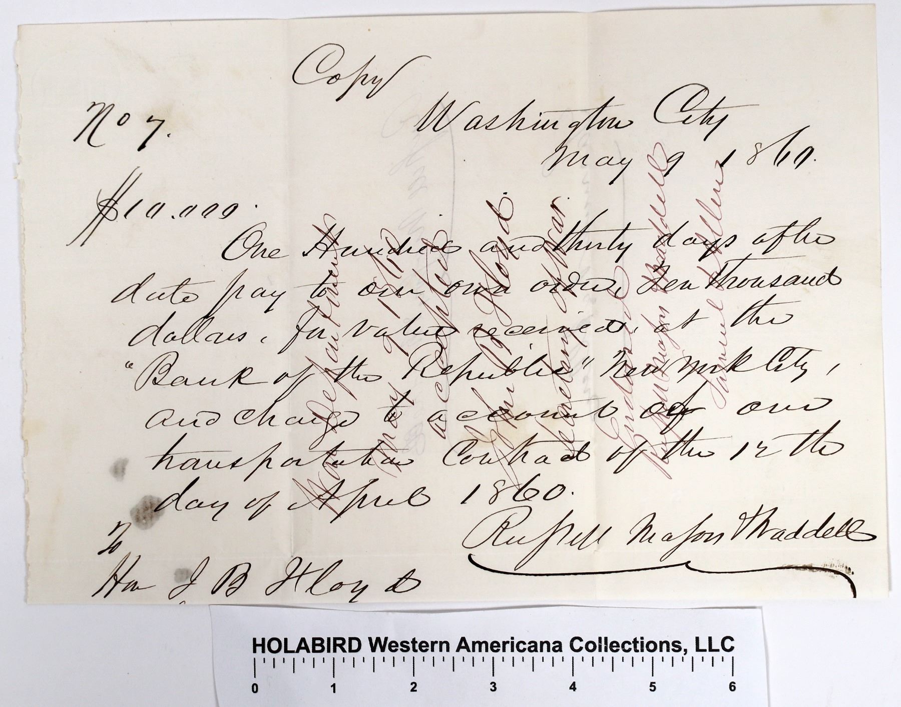 Extremely rare and very historically important. No. 7. Dateline Washington City, May 9, 1860 (just a month after the first Pony Express trip). $10,000, to be paid in 130 days, for value received at the Bank of the Republic in New York City and charge to account of our transportation contract of the 12th day of April 1860. Signed Russel Major Waddell. Addressed to Hon. JB Floyd. Signed on the back by Russel, Major & Waddell. Also signed by Samuel Allen. Red ink on front says "War Department, May 9 1860 accepted. John B. Floyd. Secretary of War. Endorsed Russel Major Waddell. Samuel Allen." 5.5 x 8" Folds, ink stains on reverse.