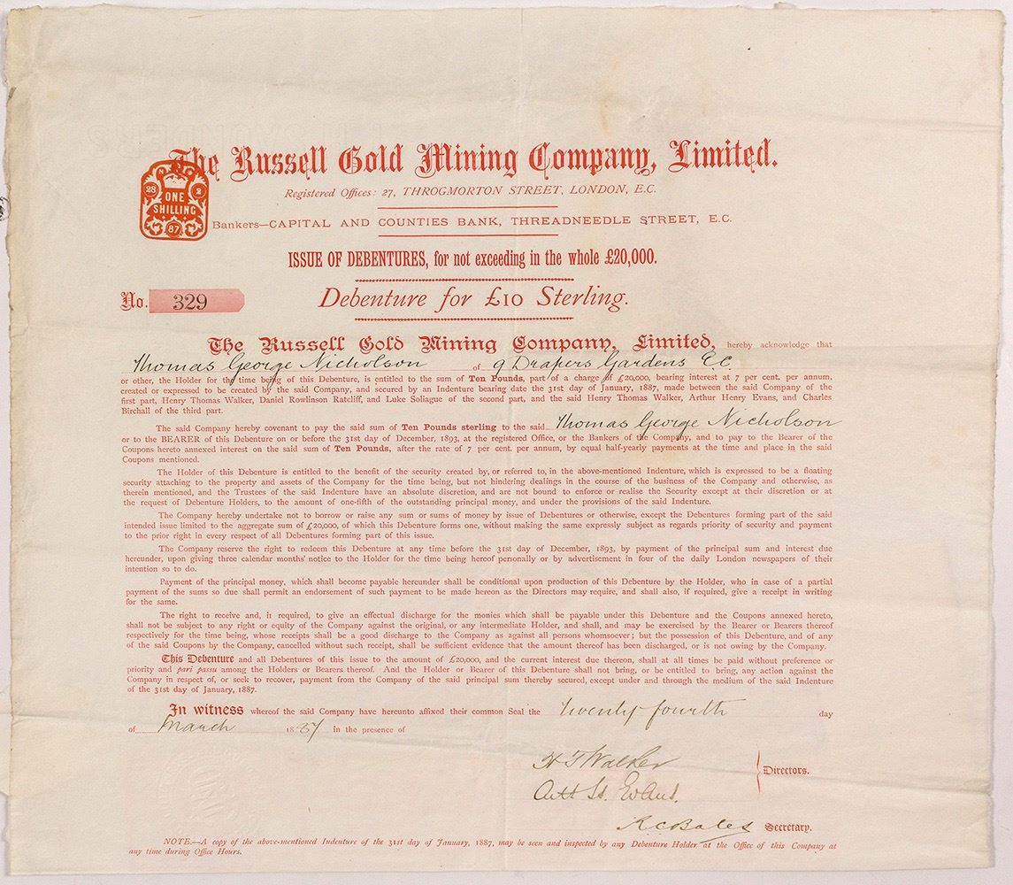 Debenture #329 for L 10 Sterling, issued to Thomas George Nicholson (London) on March 24. Three coupons attached. Red print on parchment paper. It has a red, embossed, one-shilling revenue stamp. Signed by two directors and the secretary. The property was a British-financed gold mining company that operated a 40-stamp mill and cyanide plant. It later reorganized as the New Russell Gold & Exploration, Ltd., and acquired holdings in Colorado. Like other early British mining certificates, it has neither a vignette nor a border. 16 x 16.” Debenture is very fine. Four remaining coupons are bent and folded. This is a very important mining location. (Al Adams Gold Rush Memorabilia Collection) Date: 1887 Location: Cripple Creek, Colorado HWAC# 55066