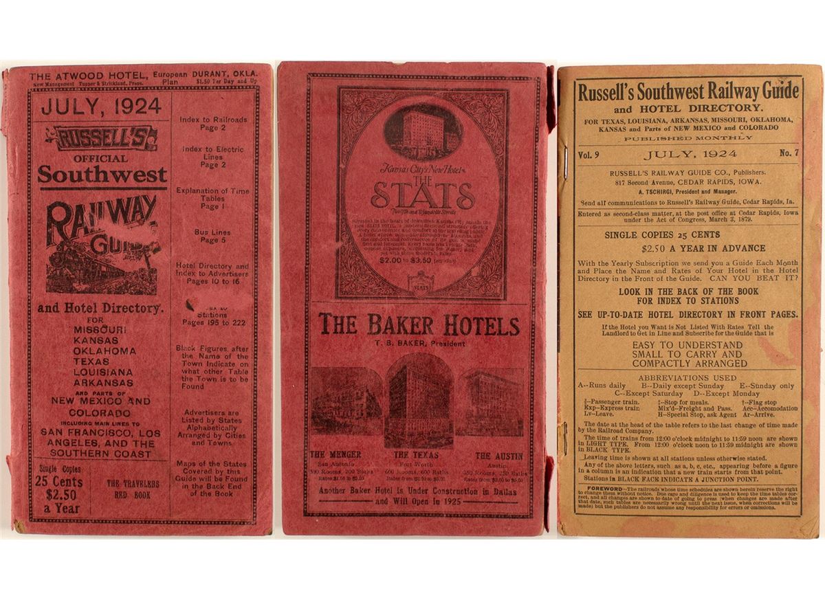 A directory for Texas, Louisiana, Arkansas, Missouri, Oklahoma, Kansas and parts of New Mexico and Colorado. July 1924. It was published by Russell's Railway Guide Co. Iowa. 287 pages. The covers are paper, and have some wear including creases. There are no listings in OCLC for this edition. Rarity: [i].City: County: State: Date: 1924