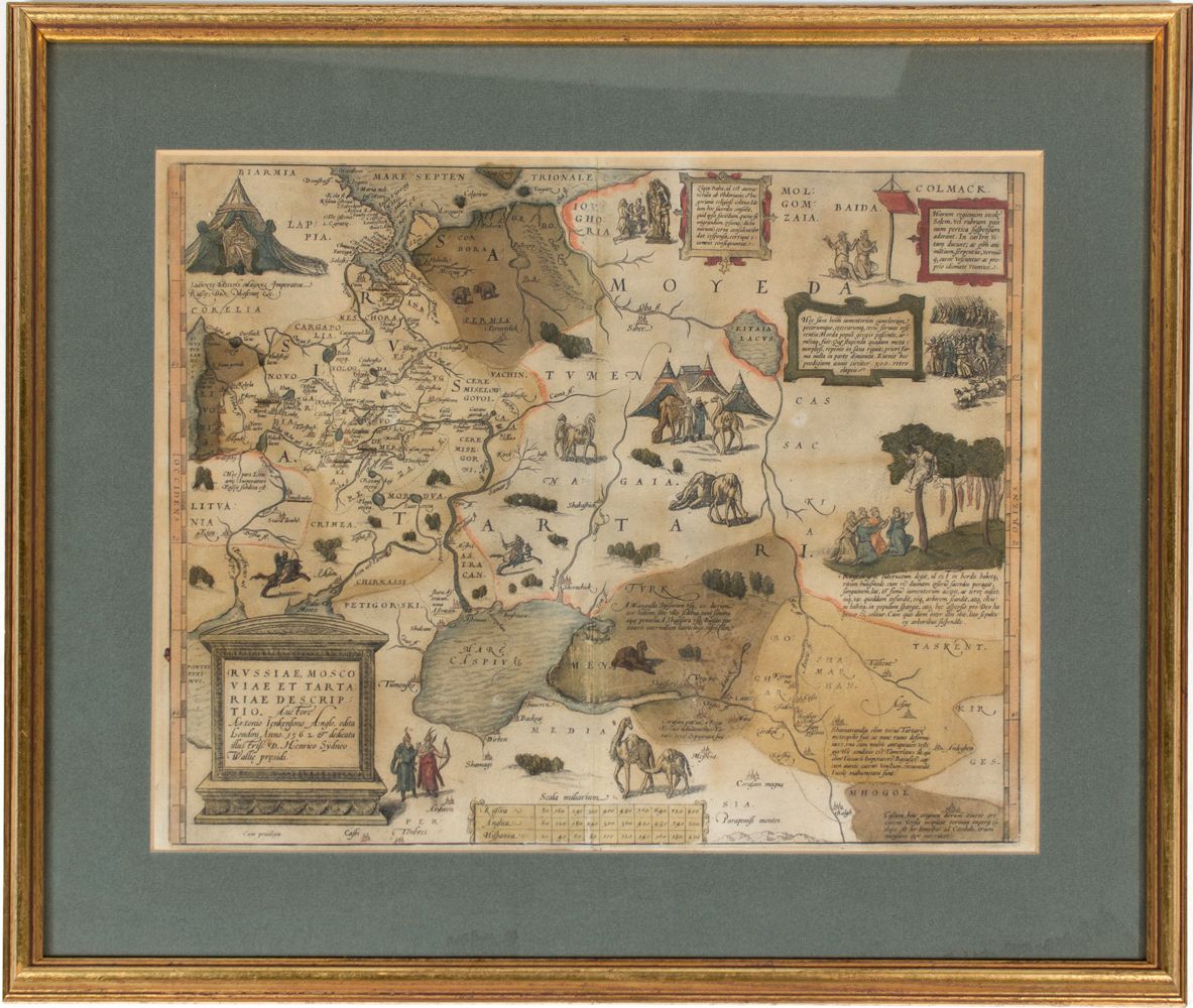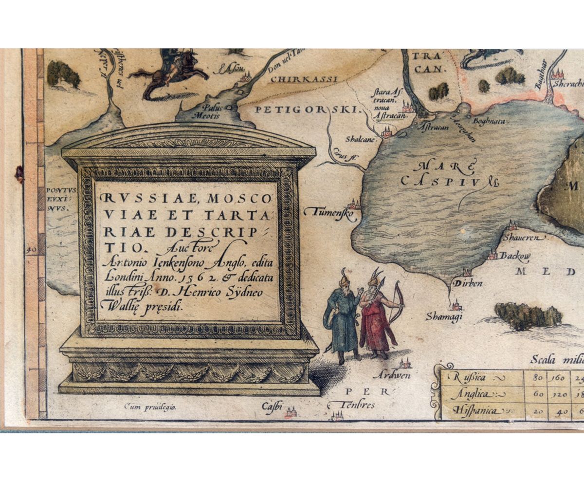 Ortelius. Anthony Jenkinson's rare map of Russia was drawn in 1562. The map covers the region from the Gulf of Finland, Lithuania and the Black Sea to the Sur River, Tashkent, the Kossack Regions, etc. From Ortelius' Theatrum Orbis Terrarum, the first modern atlas. The map was engraved by Franz Hogenberg from the original by Anthony Jenkinson of the English Muscovy Company drawn in 1562. Jenkinson travelled to Bukhara in 1557-59 and to Russia three more times thereafter, but into Asia (as far as Persia) during only one of these trips. The vignettes are based upon Marco Polo's travels, and include over a dozen indigenous and mythical scenes, costumed locals and animals. 17 1/2 x 14".