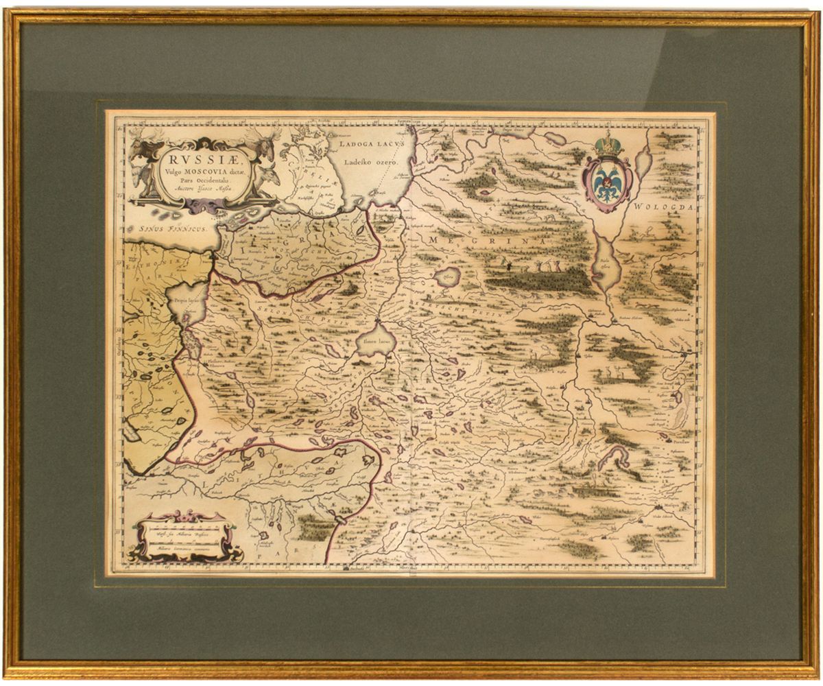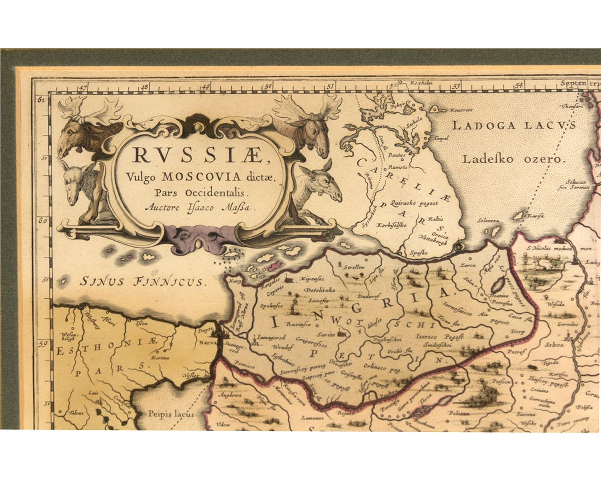 Bleau. This is an attractive early 17th century map showing the region of Russia from Estonia to Moscow. Topographical features are displayed along with major cities, towns, rivers, lakes, forests, mountains, and islands. Wildlife is depicted throughout the map along with a scene of natives hunting bears in the upper right quadrant of the map. A coat of arms distance scale and decorative title cartouche adorned with male and female moose further enhance the map.