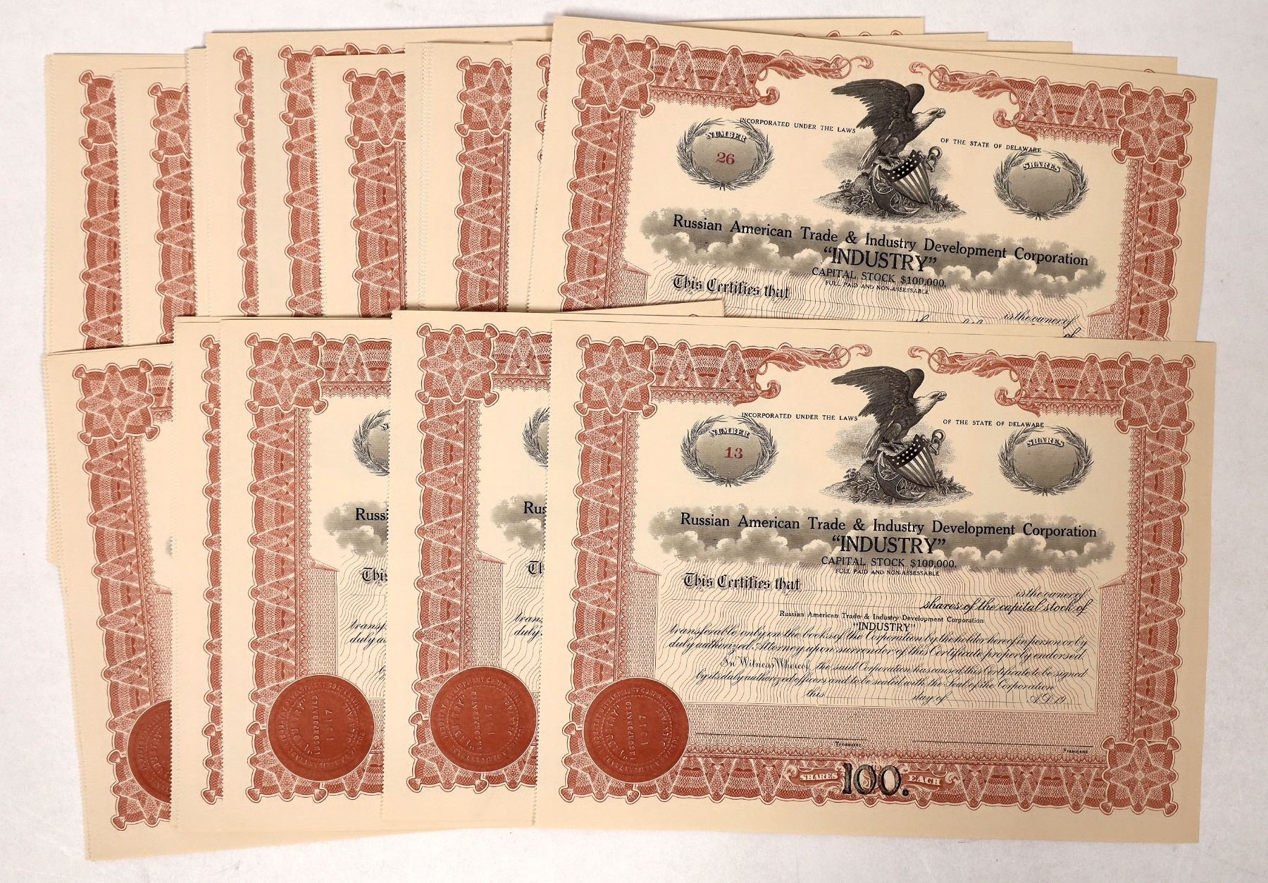 About 50 unissued Russian American Trade and Dev. stocks.