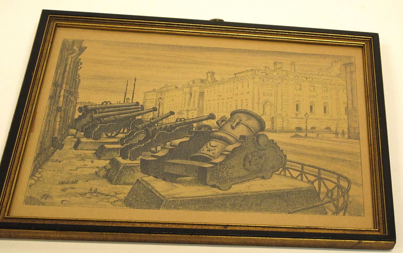 12 x 15" framed print by Dakuzhinsky from 1922. The print is of a charcoal sketch of cannon displayed in front of a possible government building. The cannon display is notable because of the types of cannon present, which includes the classic dolphin handled bronze cannon of the 1600's, cannon of the 18700's and the very large short very stubby cannon. cannon. Provenance: Ben-Tschavtschavadze collection of Ontario. Date: Location: zRussia HWAC# 56867