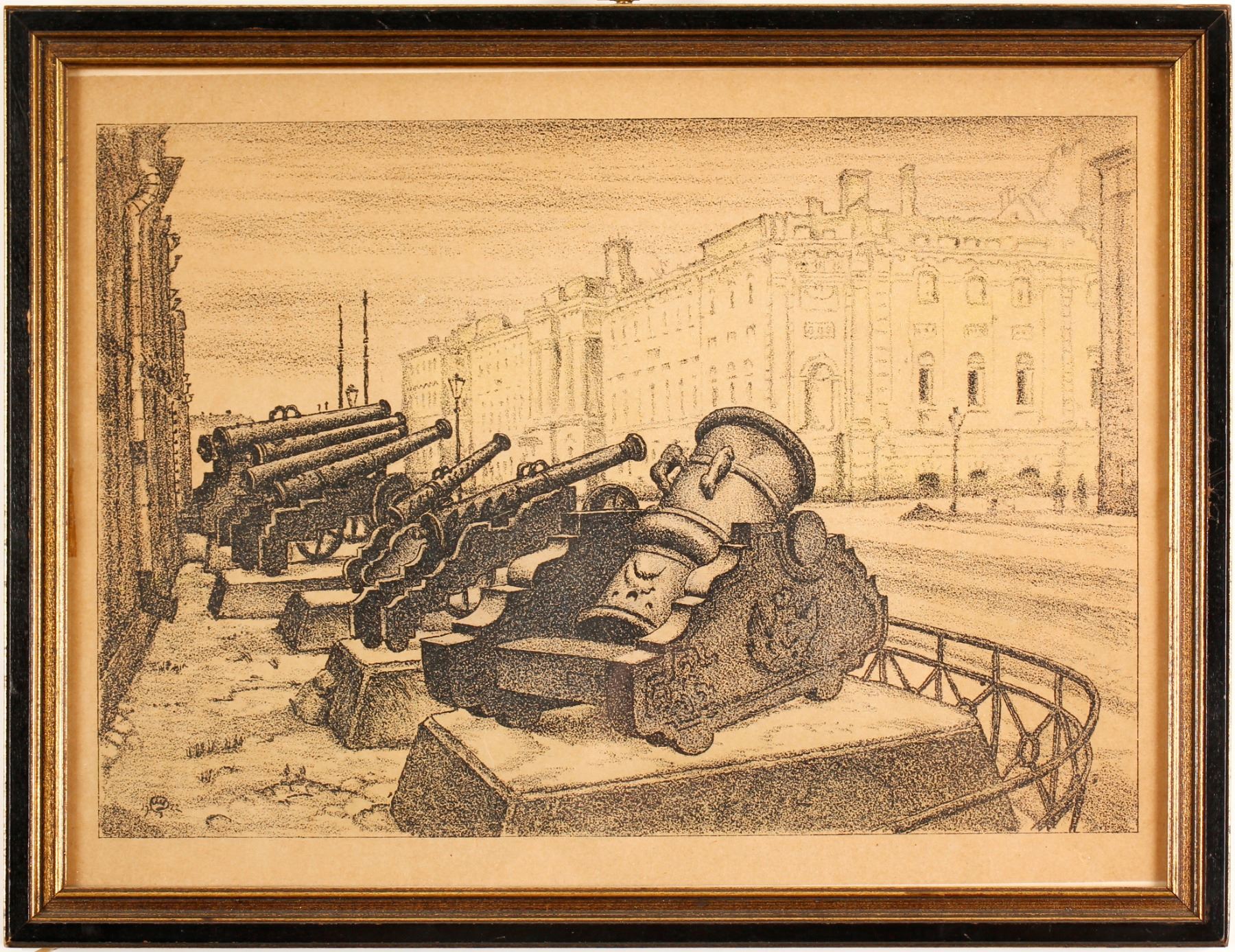 12 x 15" framed print by Dakuzhinsky from 1922. The print is of a charcoal sketch of cannon displayed in front of a possible government building. The cannon display is notable because of the types of cannon present, which includes the classic dolphin handled bronze cannon of the 1600's, cannon of the 18700's and the very large short very stubby cannon. cannon. Provenance: Ben-Tschavtschavadze collection of Ontario. State: Russia City: Date: HWAC# 56867