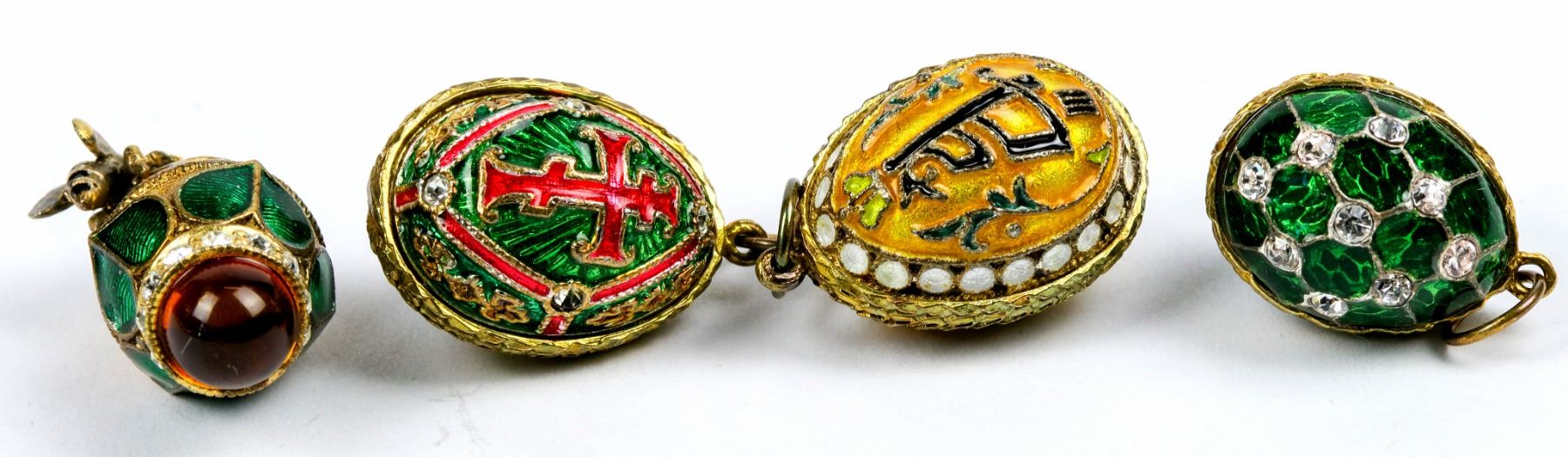 Cloisonne--four unique pendants--all handmade Faberge style created by skilled artisans. Each of these pendants is also inlaid with jewels.1) Beehive with bee attached, amber bead at base; 2) Fleur de Lys design on one side and Japanese symbol on reverse; 3) Deep green base with crystals in a diamond shaped trellis design on both sides of pendant; 4) Deep green base with red cross on one side and Gandaberunda on the reverse side, set with tiny diamonds. All of the patterns eye-catching. The Pendants are special traditional art. Please see photos