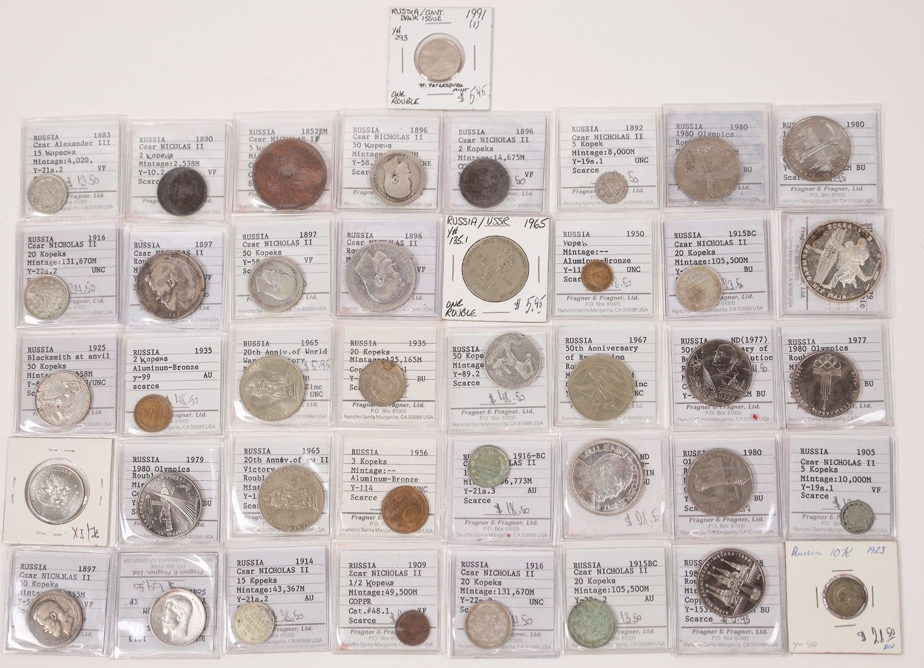 Lot of 41 coins from Russia. 1852 Czar Nicholas I (5 kopeks; 1883 Czar Alexander III (15 kopeks); Czar Nicholas II (17 coins, different denominations from 1/2 kopeks to 50 kopeks; ten coins from1923-1967; 1977-1980 Russian Olympic coins; silver Lenin medal.