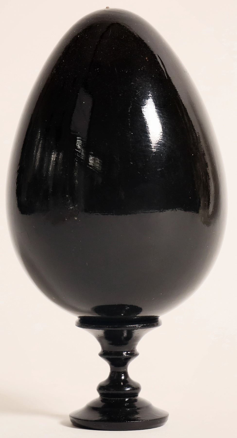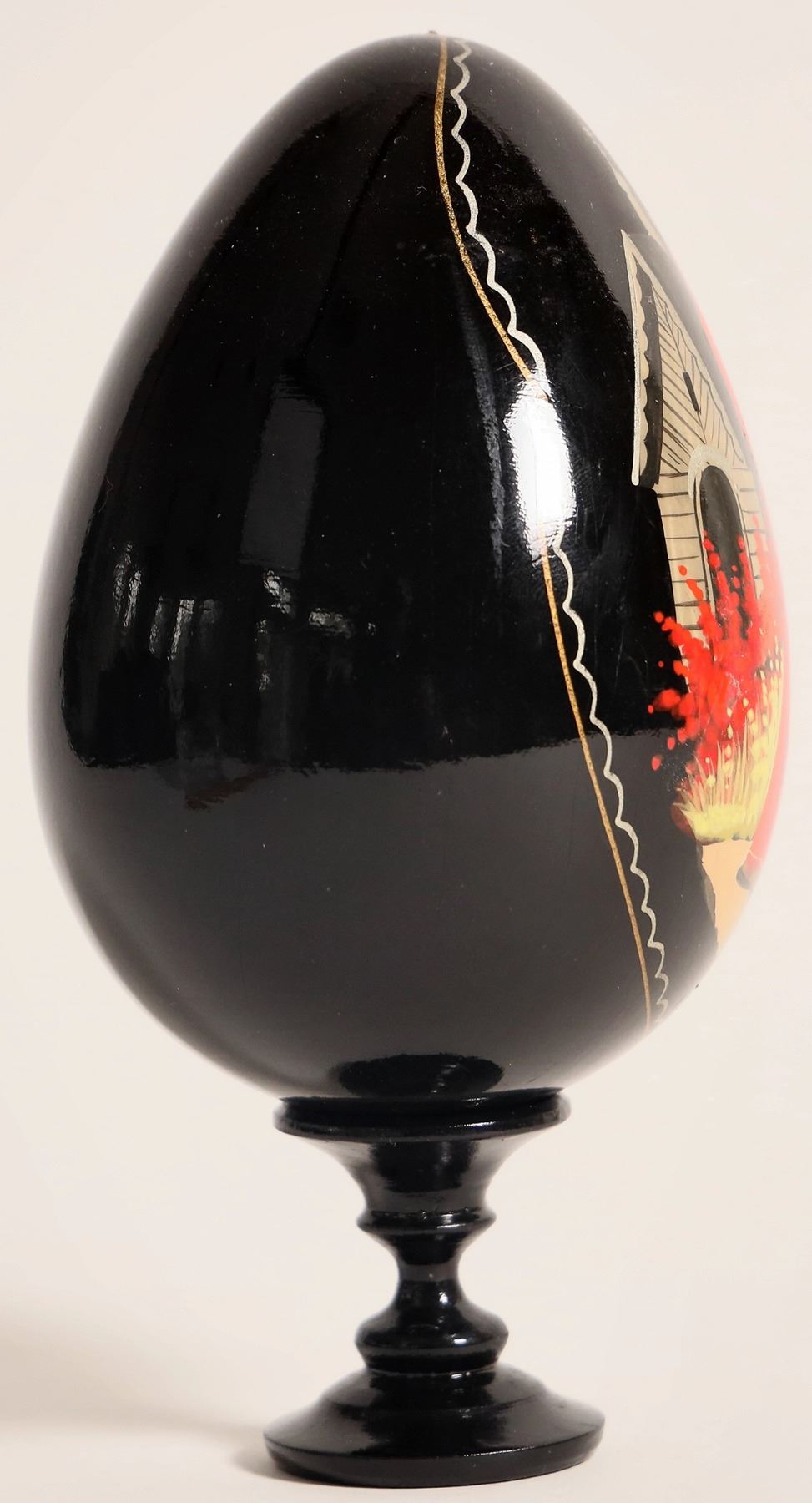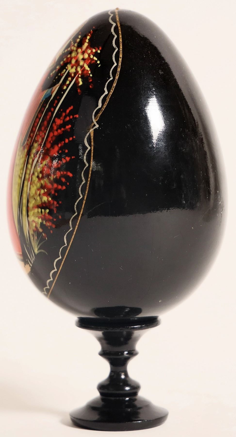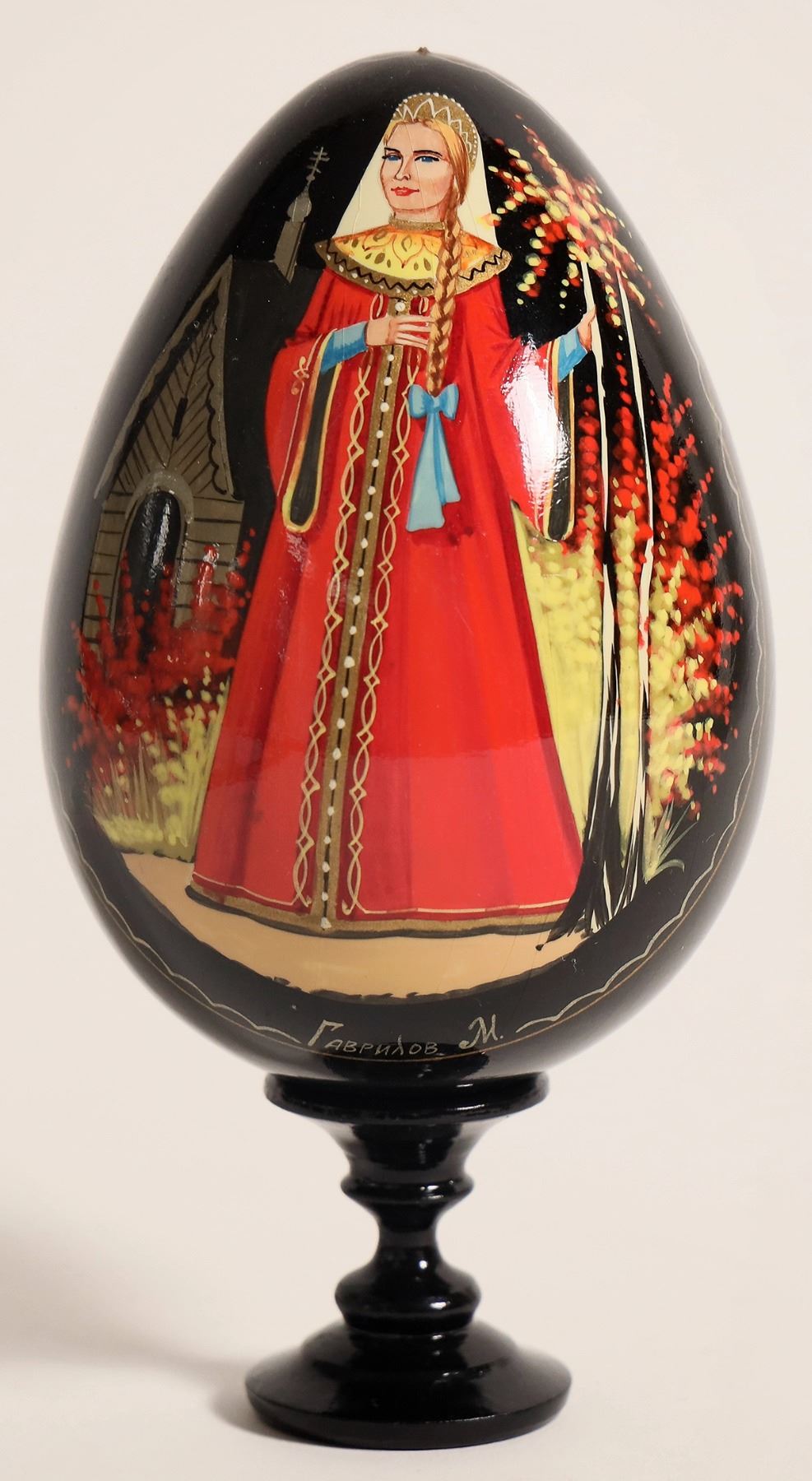 Vintage Russian hand painted egg of queen like figure. Beautifully painted, black background. Signed in russian. Approx. 7" high with stand.[ Russia