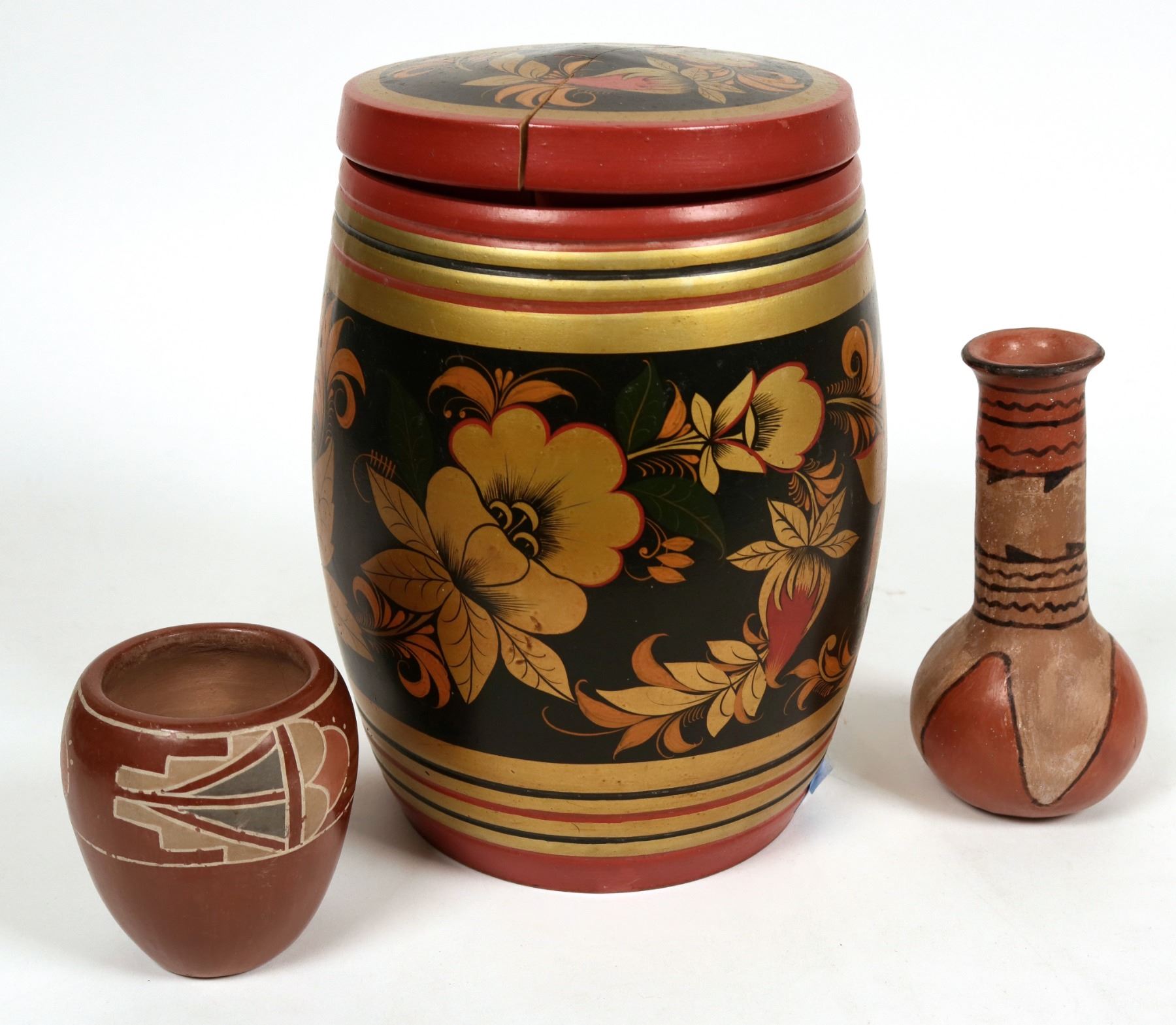 Hand painted wooden barrel shape with lid. Has cracked lid, but is still in tact. Please inspect. 7.5" x 11" tall. Russian Influence. these are not a matched or nested set. See photos for more details. Russia