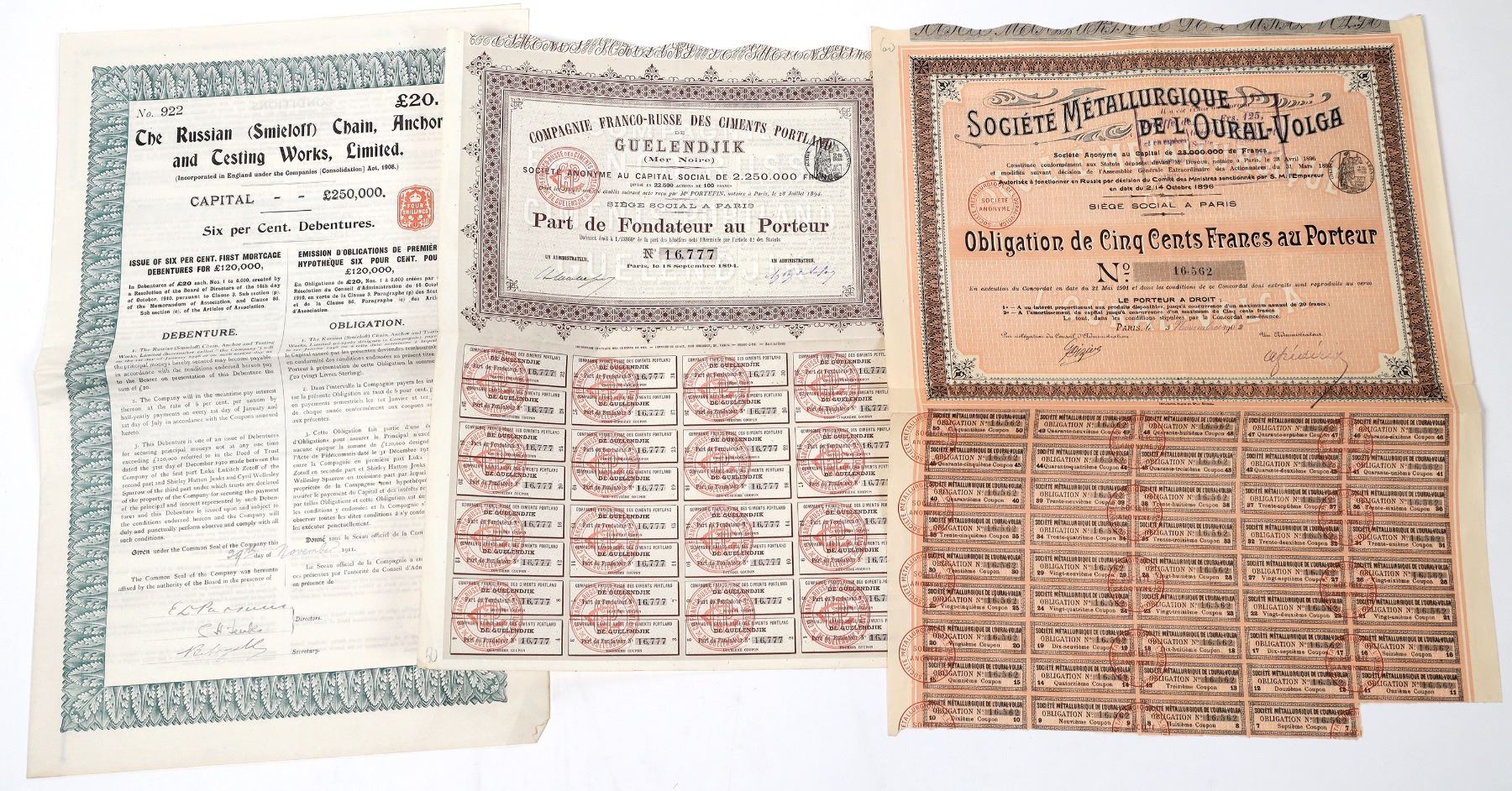Three different stock certificates from Russian mining companies including the Russian (Smieloff) Chain, Anchor, and Testing Works (1911), the Compagnie Franco-Russe des Ciments Portland de Guelendjik (1894), and Societe Metallurgique de L'Oural-Volga (1902). Different sizes, largest is 18.5 x 11.75 inches. Good condition. Russia