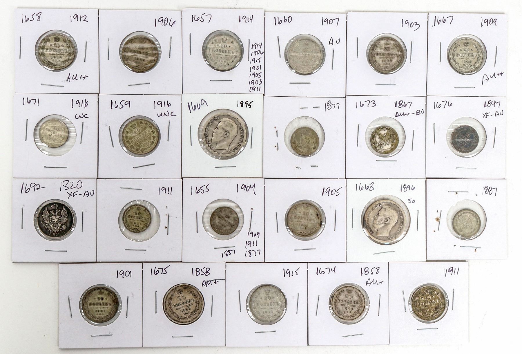 Russian minor silver coin collection circa 1820-1916. Later coins are EF-UNC. Ten kopek: 1847, 1867, 1877, 1887, 1907, 1911, 1916 (unc). Twenty kopek: 1820, 1858, 1901, 1903, 1905, 19096, 1907, 1909, 1911, 1912, 1914, 1915, 1916. Twenty five kopek: 1858. Fifty kopek: 1895, 1896.