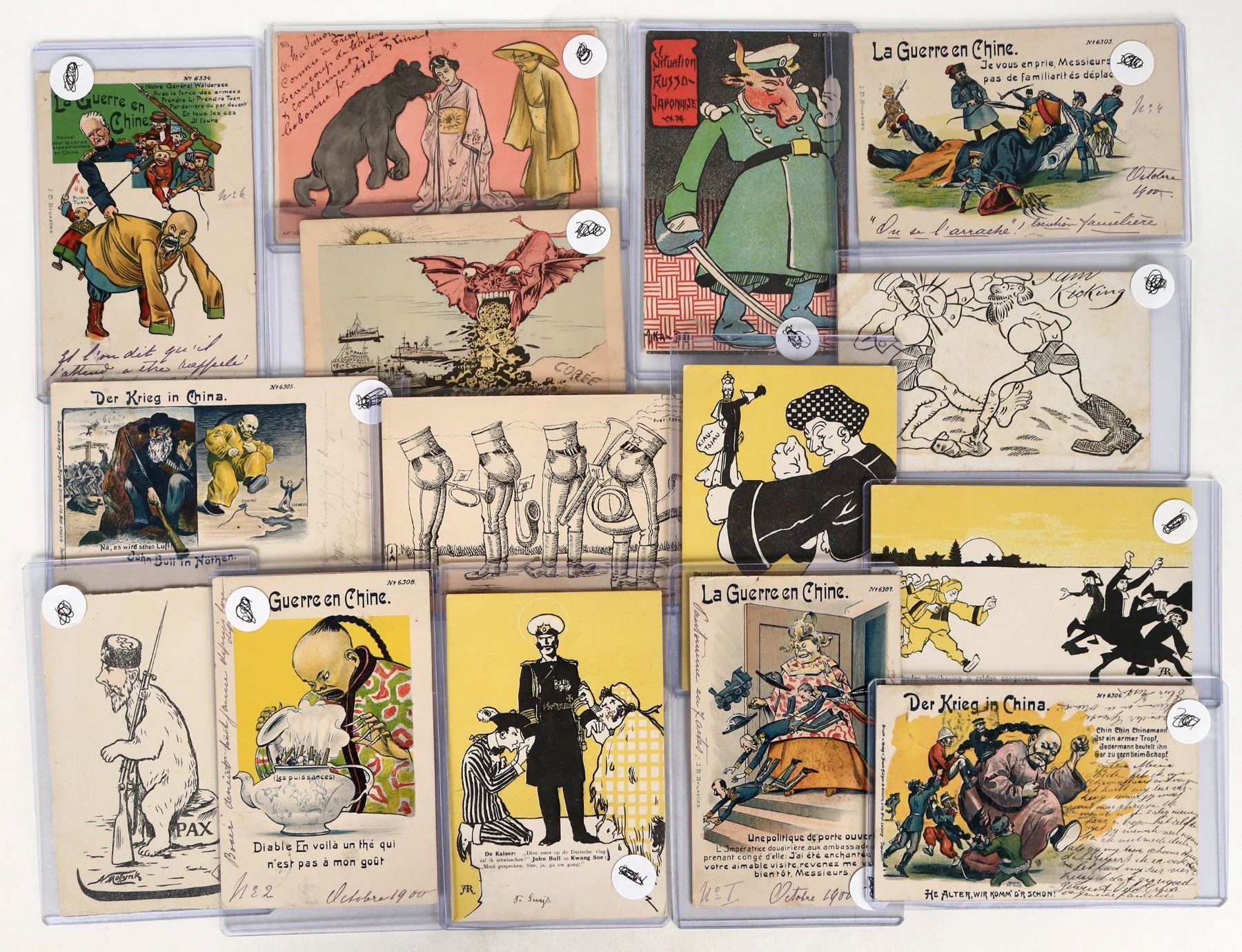 A collection of 15 postcards of caricatures from the Russo-Japanese War. Over half, 10, with postmarks, c1905-20, & 5 blank.[ Japan