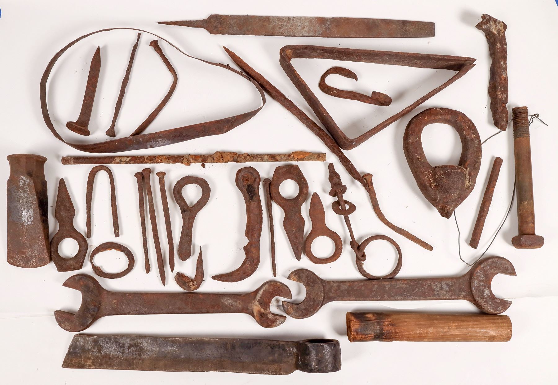 About 41 lbs. of old tools, mostly rusty. Includes file, spike, hoop and wrenches.