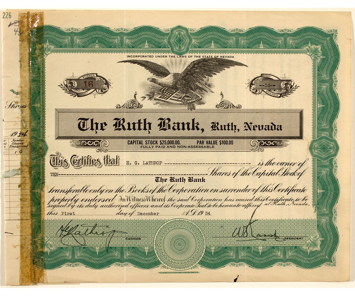 This is the first Ruth Bank stock certificate we have ever seen. Number 15, 10 shares, H. G. Lathrop on December 1, 1934. Signed by HG Lathrop cashier and W Marsh president. The Ruth Bank received its charter January 2, 1909.