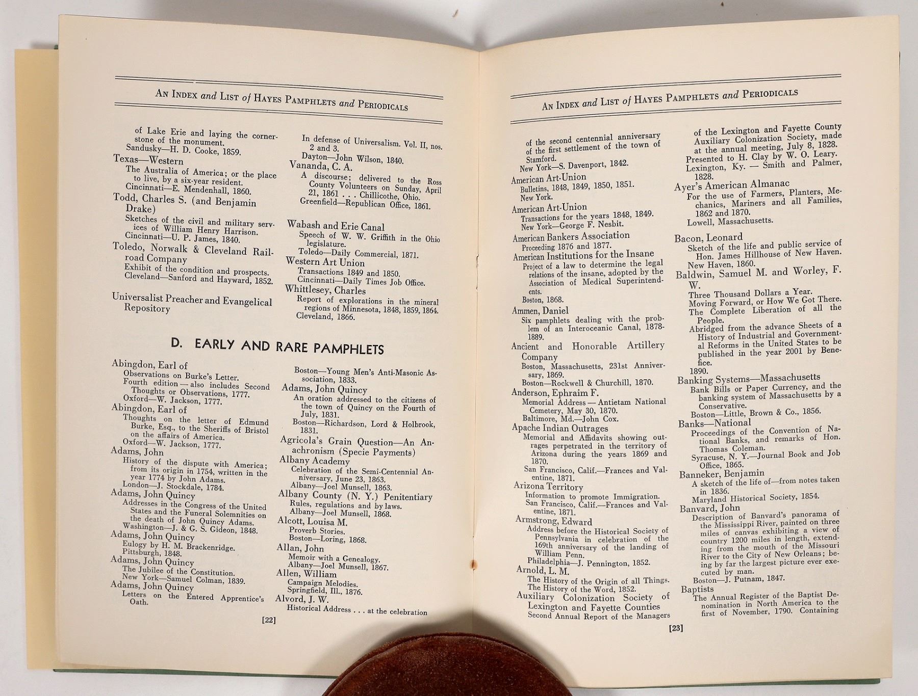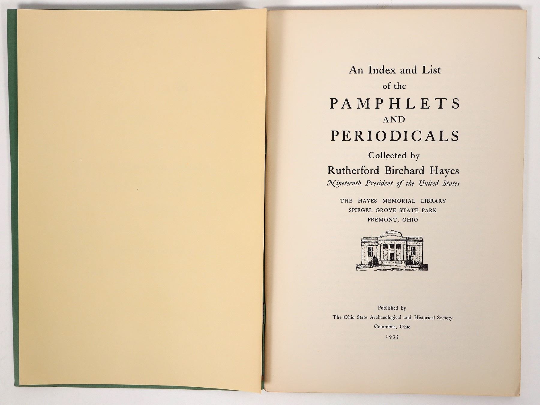 1935, An index and list of the pamphlets and periodicals collected by Rutherford Birchard Hayes. 45pp. Cover has some sun fade.