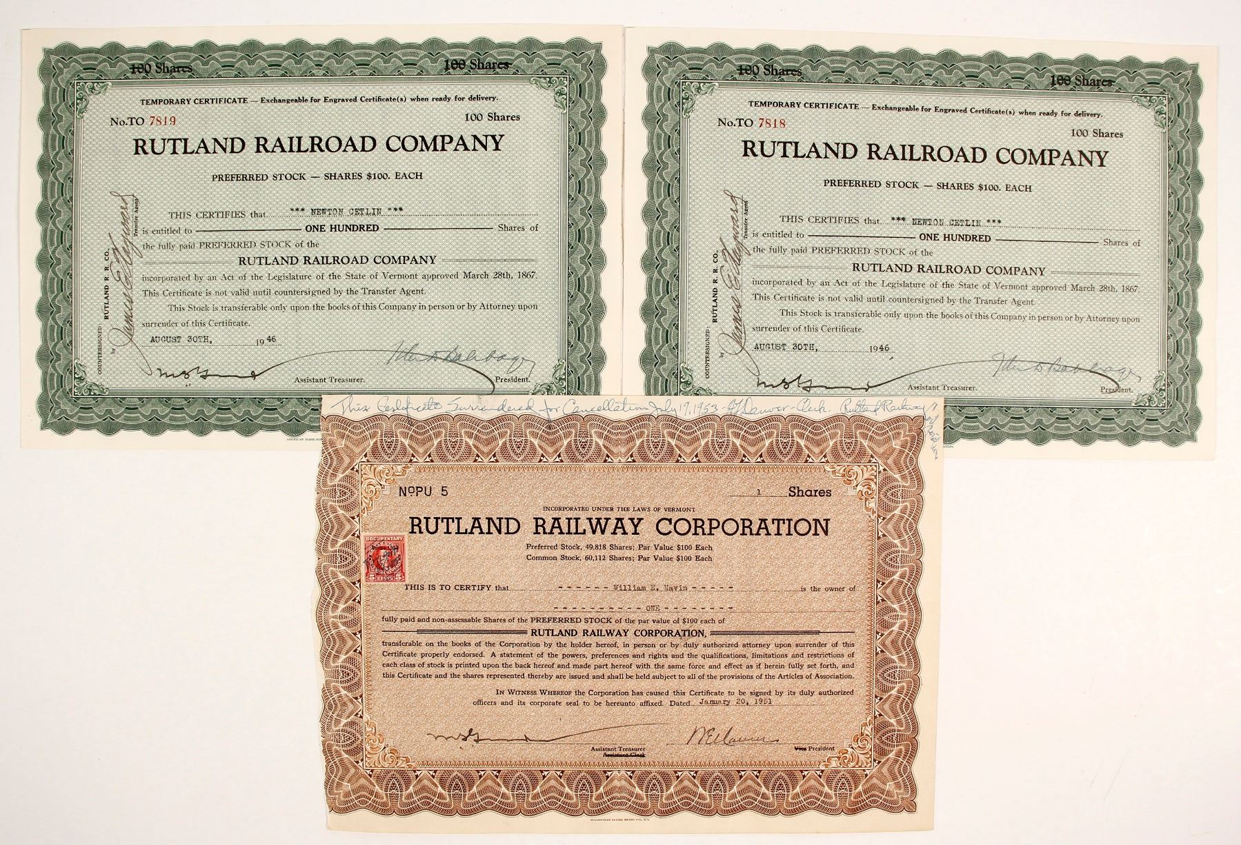 3 total certificates. One signed and cancelled, brown color background; in very good condition, the other two are signed and not cancelled, green background; both in good condition. Prag Collection.