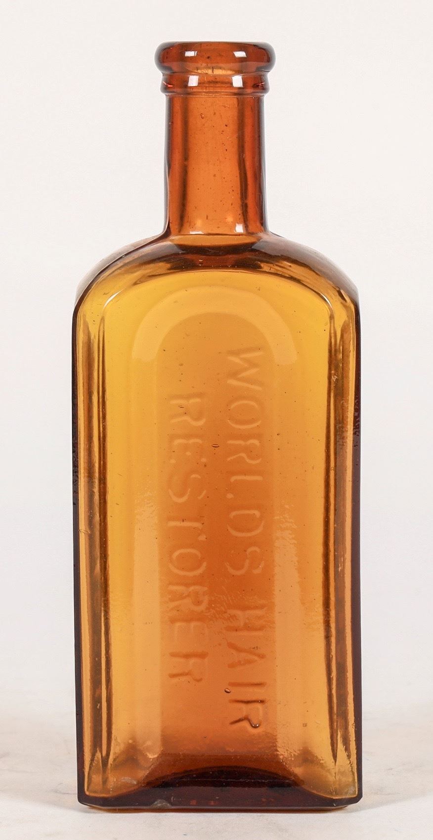 7.1" light amber Mrs. S A Allen's Hair Restorer bottle. Small base chip.
