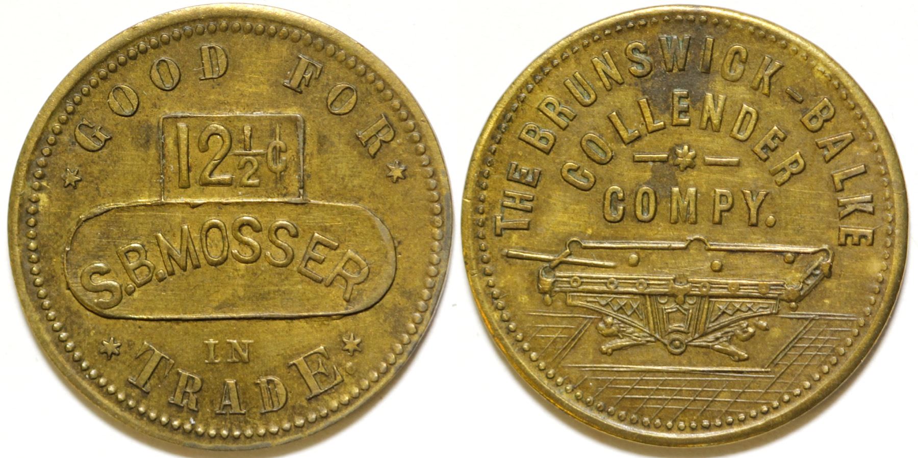 Obv.: Good For / 12 1/2c / S. B. Mosser / In / Trade; Rev.: Brunswick Balke / Collender / Compy / pictorial pool table. Br., rd., 24 mm. State: Texas City: Encinal Date: HWAC# 81459