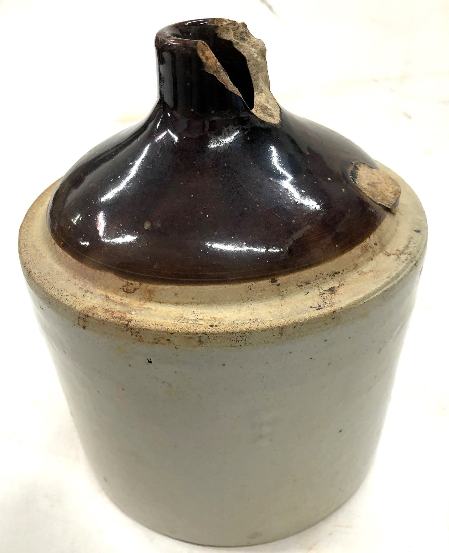 J172 in Preble. 2 tone jug. S. F. Ballin & Co./521 Harrison Ave./ Leadville, Colo. 7.5x6". Handle and 1/3 of neck missing, 2.5" lower crack extends 5" on base, side ding. Please inspect.