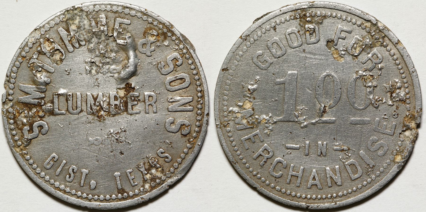 GF 1.00 IT token from lumber town in east Texas. Unlisted HWAC# 62607 Date: 1912 Location: Gist, Texas