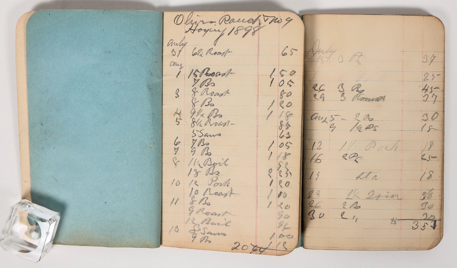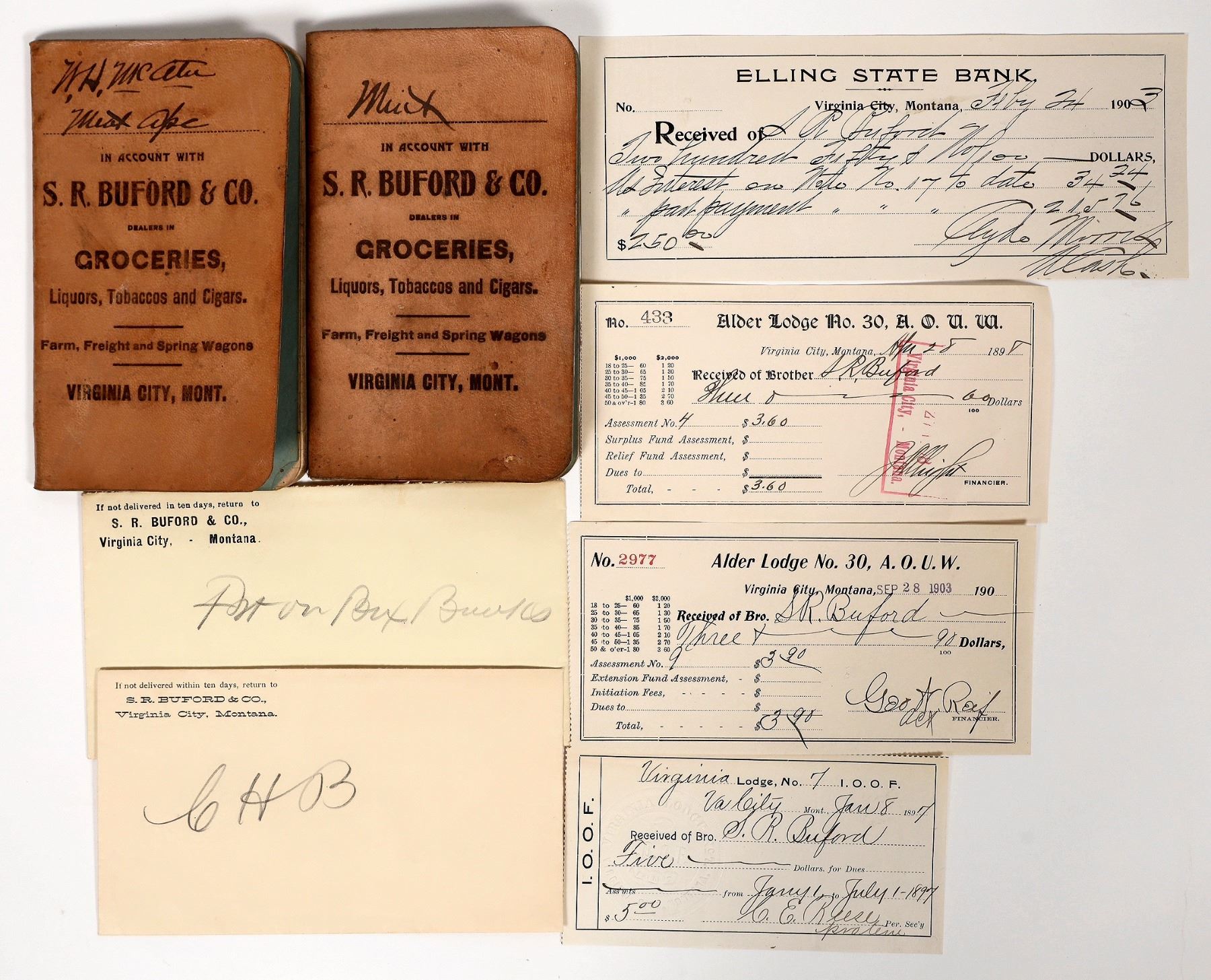 Assorted ephemera related to Virginia City mercantile dealer, stage operator and businessman, S R Buford. 2x covers, 4 1898-1903 checks, 2 account books.
