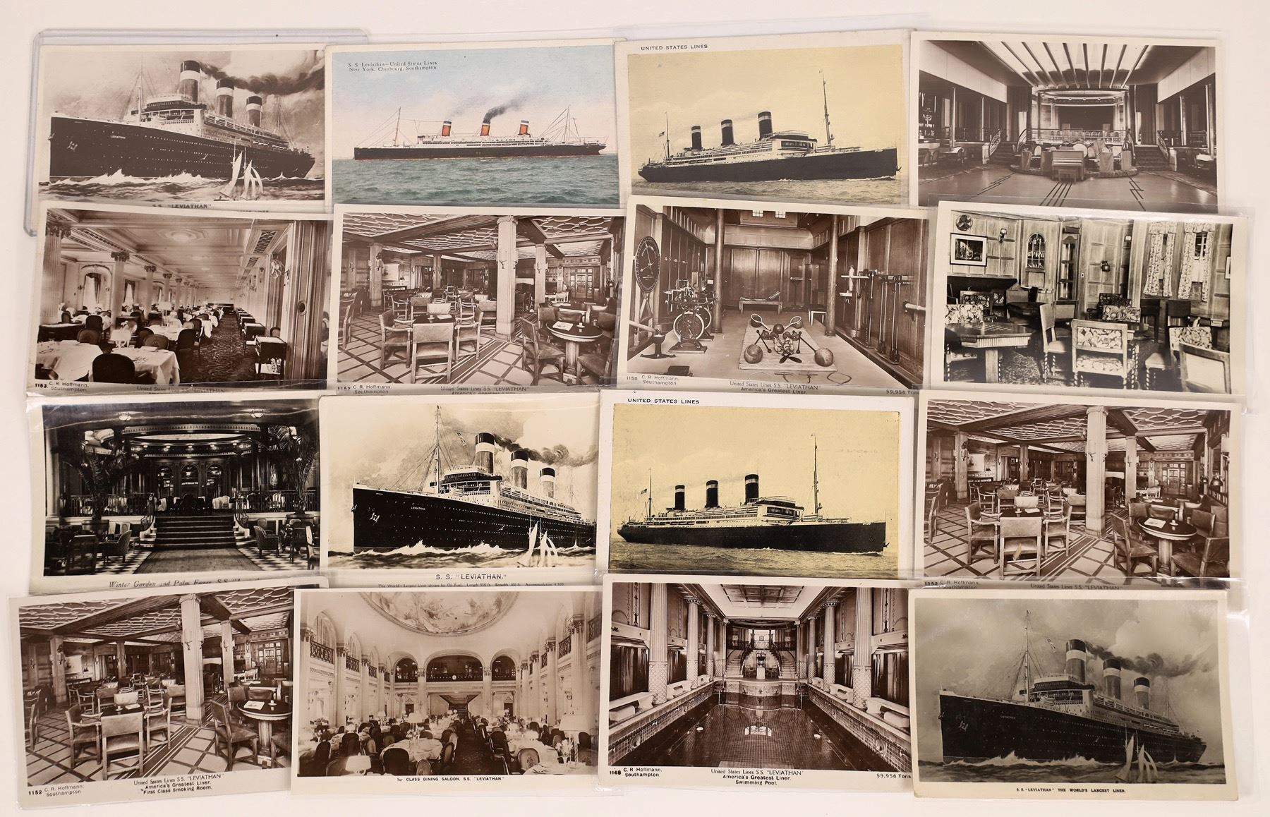 A group of 15 RPC's and postcards featuring the United States Liner Leviathan. Images show the exterior as well as interior of the gigantic (At the time) ship that also served as a troop transport during WWI. Please see photos for more detail and condition.