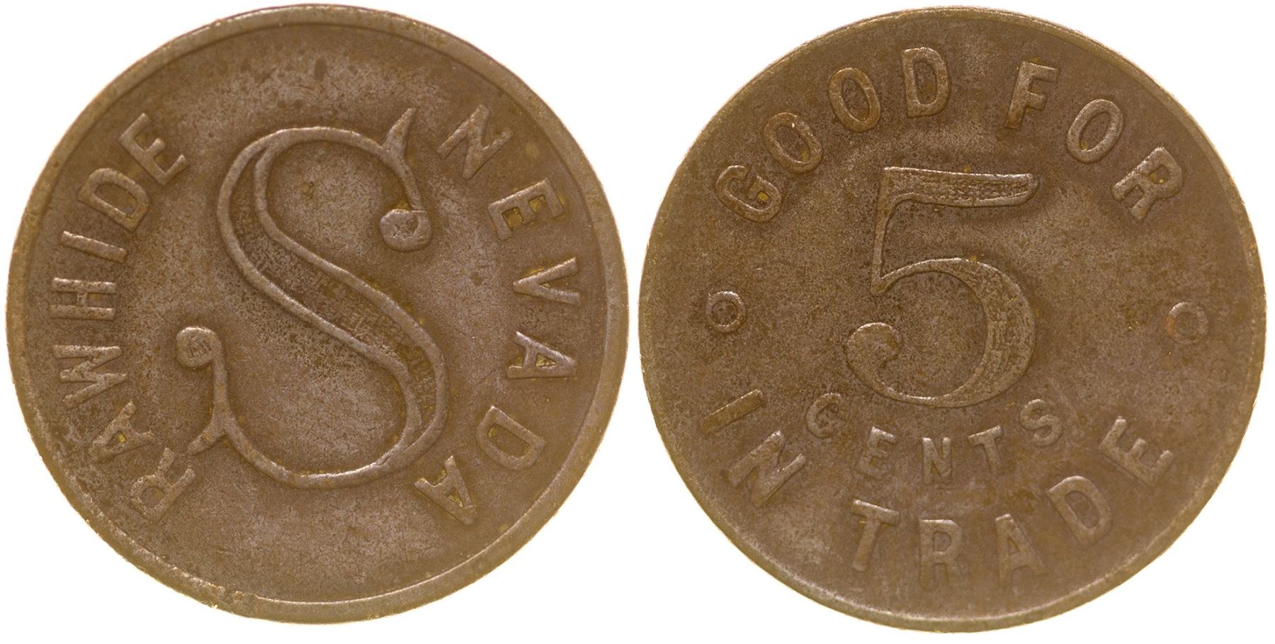 Obv.: Rawhide / Nevada / S ; Rev.: Good For / 5 / cents / In Trade; (Sheelite Club). HWAC# 55212 Date: Location: Rawhide, Nevada