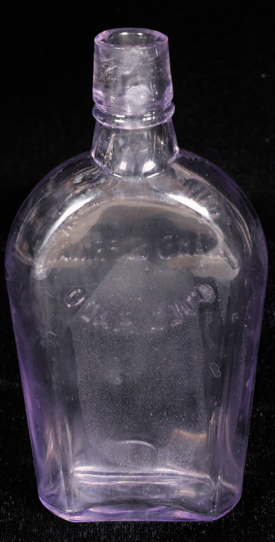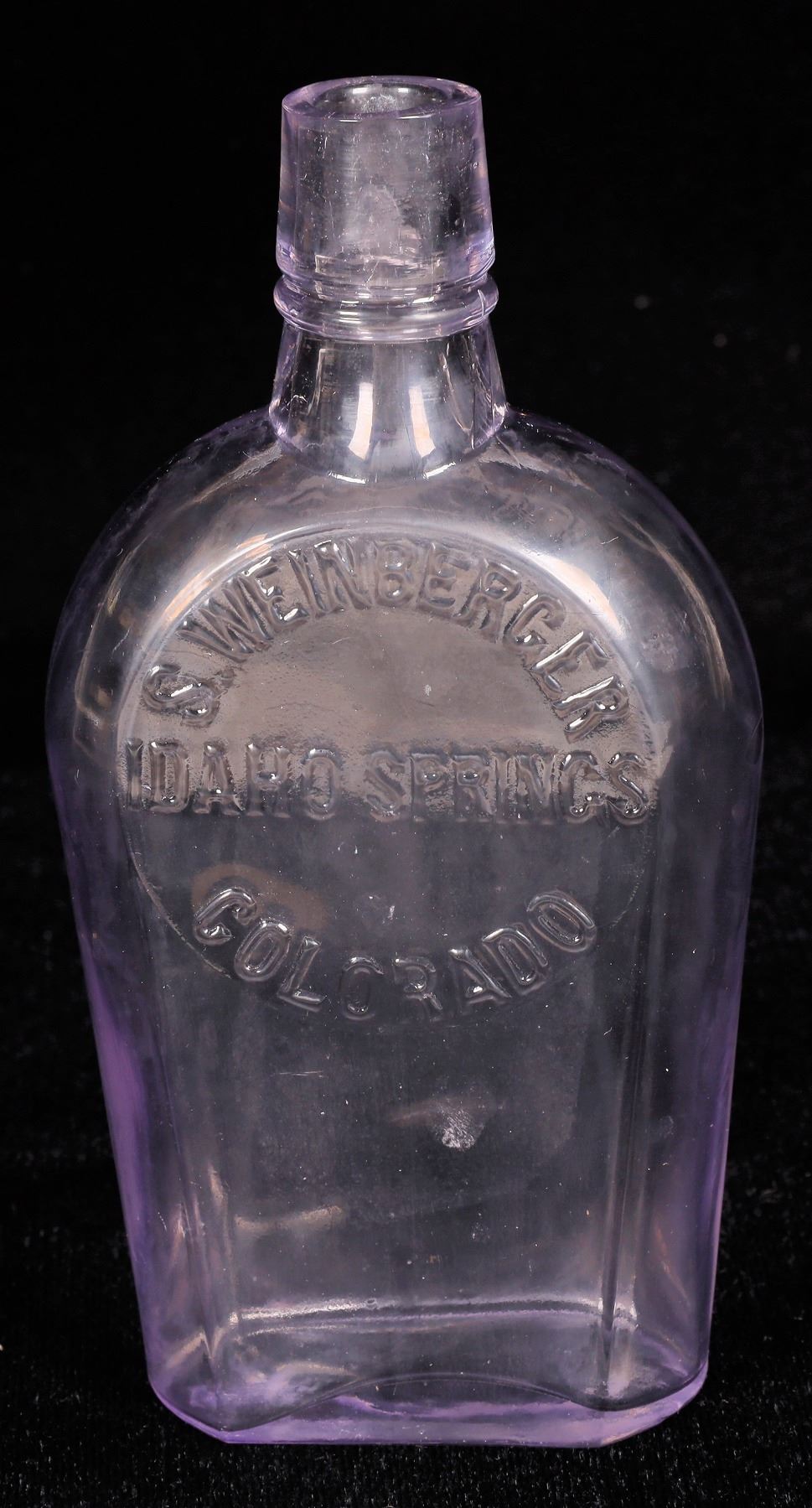 S. WEINBERGER/IDAHO SPRINGS/COLORADO Purple shoo fly whiskey flask, Clear half pint. measuring 6 inches tall with an unmarked base. tooled top. impression in back from forceps removing bottle from mould when made (typical). Clean, bright and vibrant. No impefections spotted. Preble dates c. 1897-1900. Idaho Springs Colorado