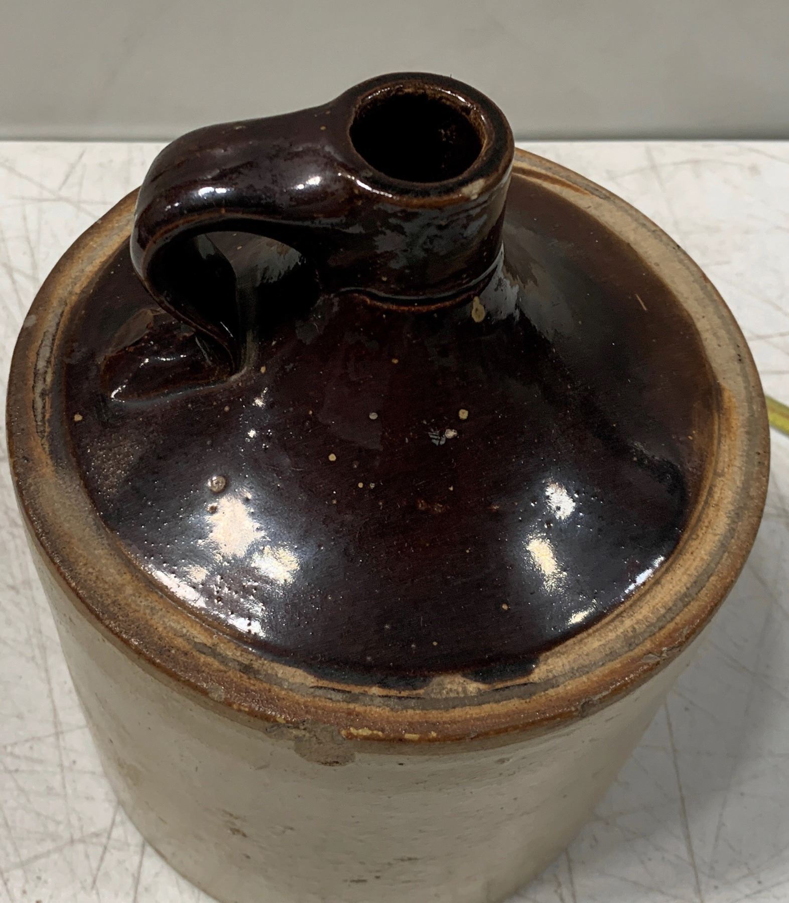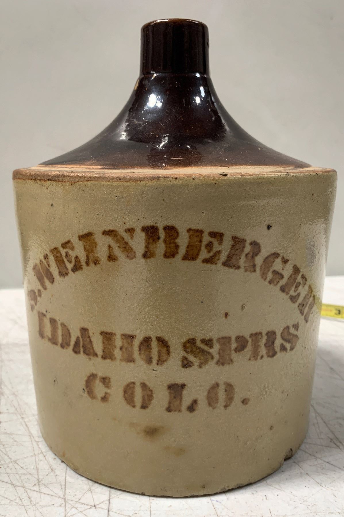 J-167 in Preble. Half gallon. Small base chip, small shoulder chip. 6" diam., 7.5" tall. (Companion piece to W-101 embossed whiskey shoo fly).