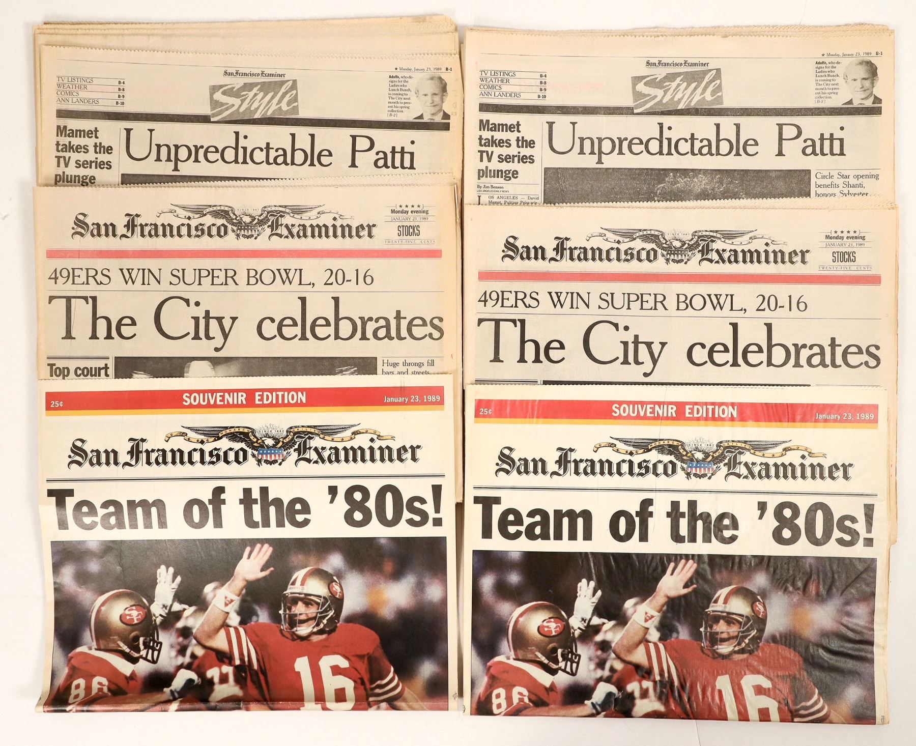 Super Bowl XXIII souvenir edition of the San Francisco Examiner. The headline touts the Joe Montana lead team as the "Team of the '80s!" These are complete newspapers that even announce the death of artist Salvador Dali. Both papers are in VERY nice condition. Please see photos for more details.