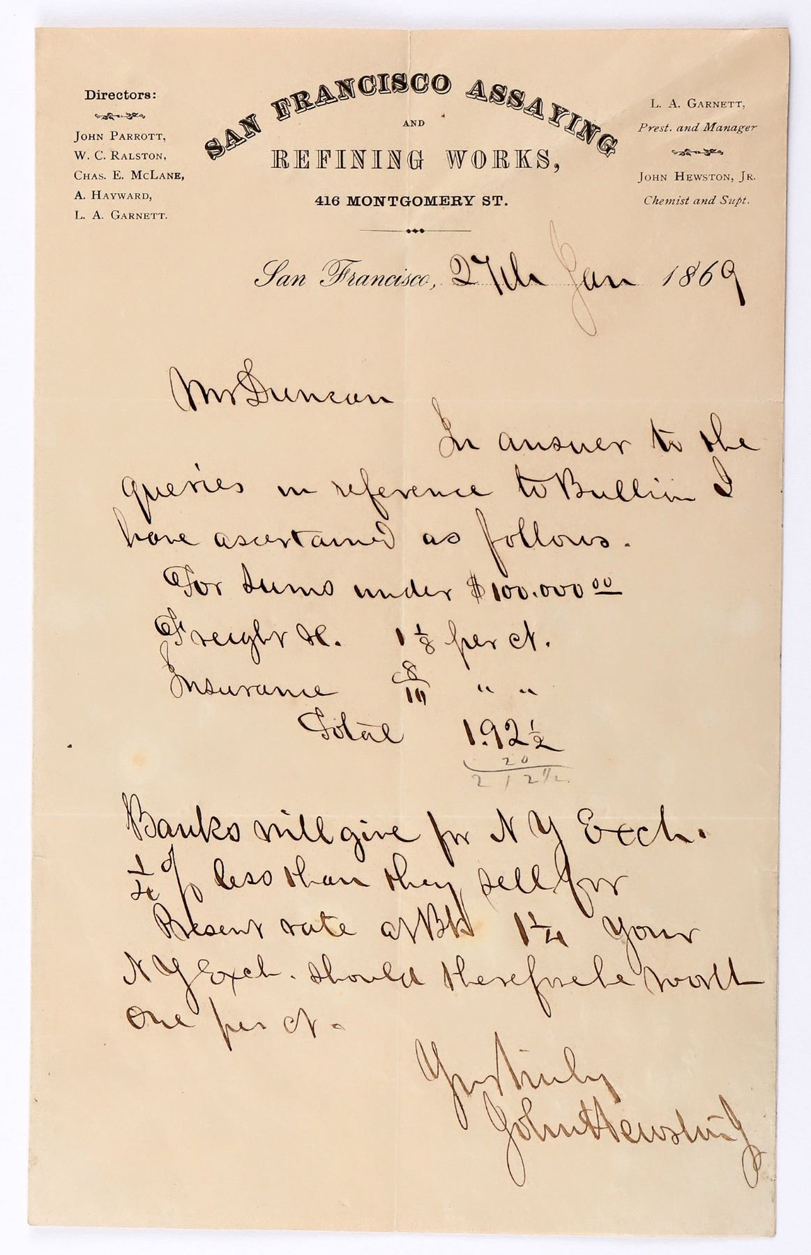 San Francisco Assaying and Refining Works Letter signed by John Hewston Jr. dated Jan. 27th, 1869. Company letterhead located at 426 Montgomery St. in San Francisco. Lists L.A. Garnett as President and Manager (Also as a Director) and John Hewston, Jr. as Chemist and Superintendent. Other directors listed are John Parrott, W.(William) C. Ralston, Chas. E. McLane, and A. Hayward. Letter to a Mr. Duncan on costs and insurance of shipping Bullion. Very Fine. Size: 5.25 x 8.5 inches. San Francisco California 1869